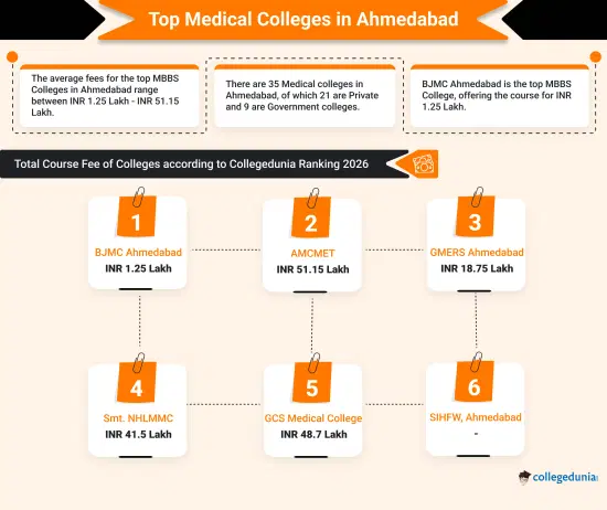 B. J. Medical College, Ahmedabad, AMC MET Medical College, Ahmedabad, and GMERS Medical College and Hospital, Ahmedabad are the top colleges in Ahmedabad according to Collegedunia Rankings 2025. B. J. Medical College, Ahmedabad, is the Medical college in Ahmedabad with a CD Score of 1353 out of 2000.
