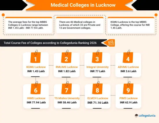 Ans. 8 colleges in Lucknow provide MBBS admissions, including 4 government and 4 private colleges. Below is the list of the top 5 Colleges along with their fees.