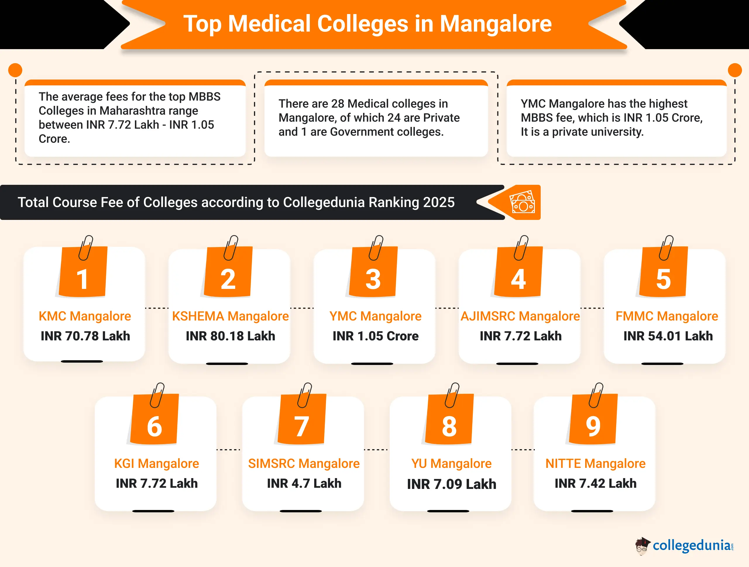 There are 9 MBBS colleges in Mangalore, all of which are private colleges. The total fee structure of the Top MBBS colleges ranges from INR 7.72 Lakh to INR 1.05 Crore. In the table below, we have compiled the Top 10 MBBS Colleges in Mangalore, along with their fee structures, Seats, NEET Cutoff, and Locality.