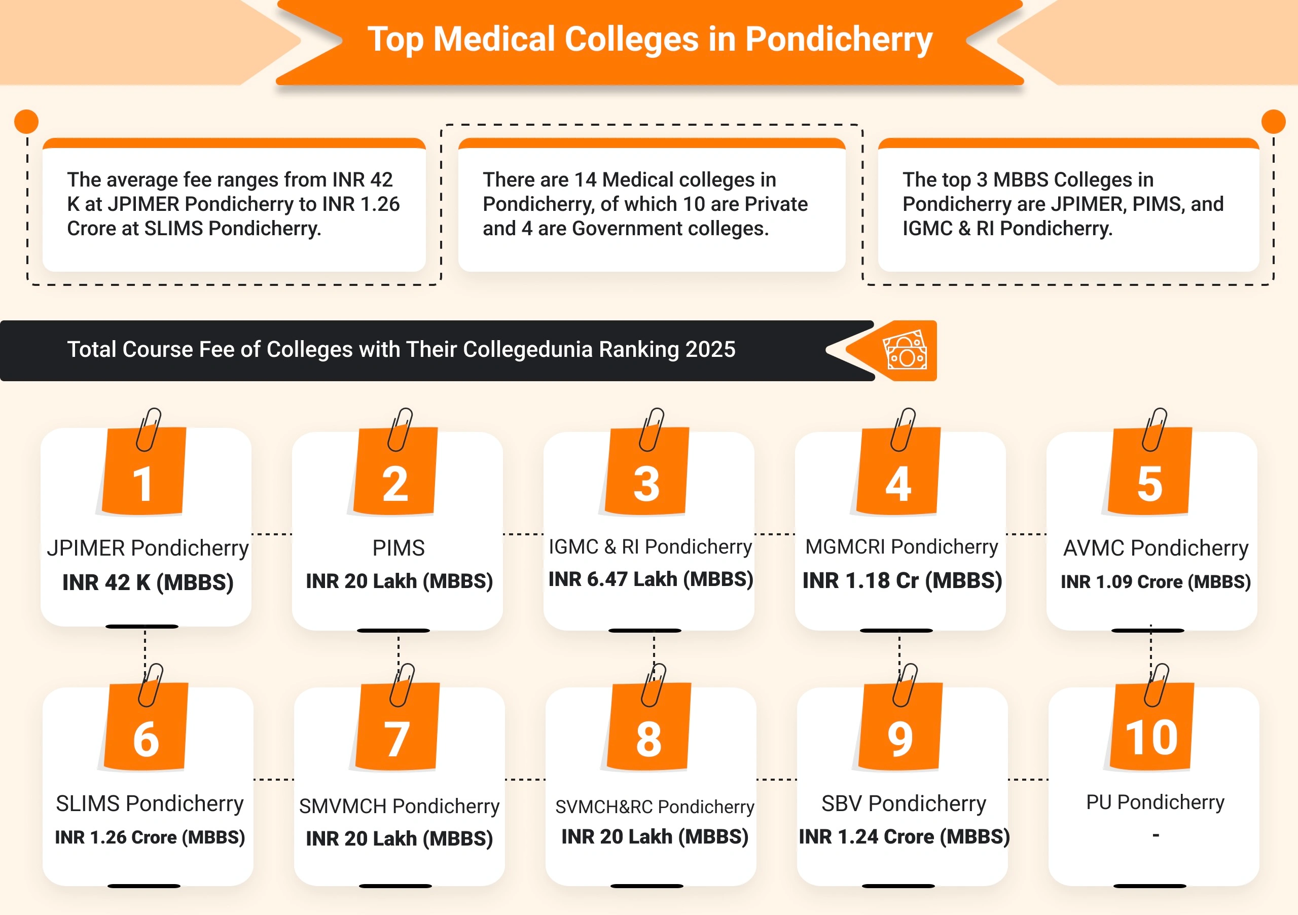 The following is a list of the best medical colleges in Pondicherry based on Collegedunia, NIRF, IIRF, and India Today rankings, along with their India and State/City ranks.