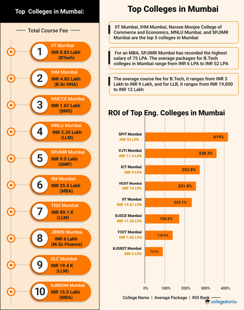 - Fees: The fee range for top Mumbai colleges varies by course. The average course fee for an MBA ranges from INR 1.8 Lakh to INR 26 Lakh, for B.Tech, the average fee ranges from INR 3 Lakh to INR 9 Lakh, and for LLB, the average fee ranges from INR 19,000 to INR 12 Lakh.
