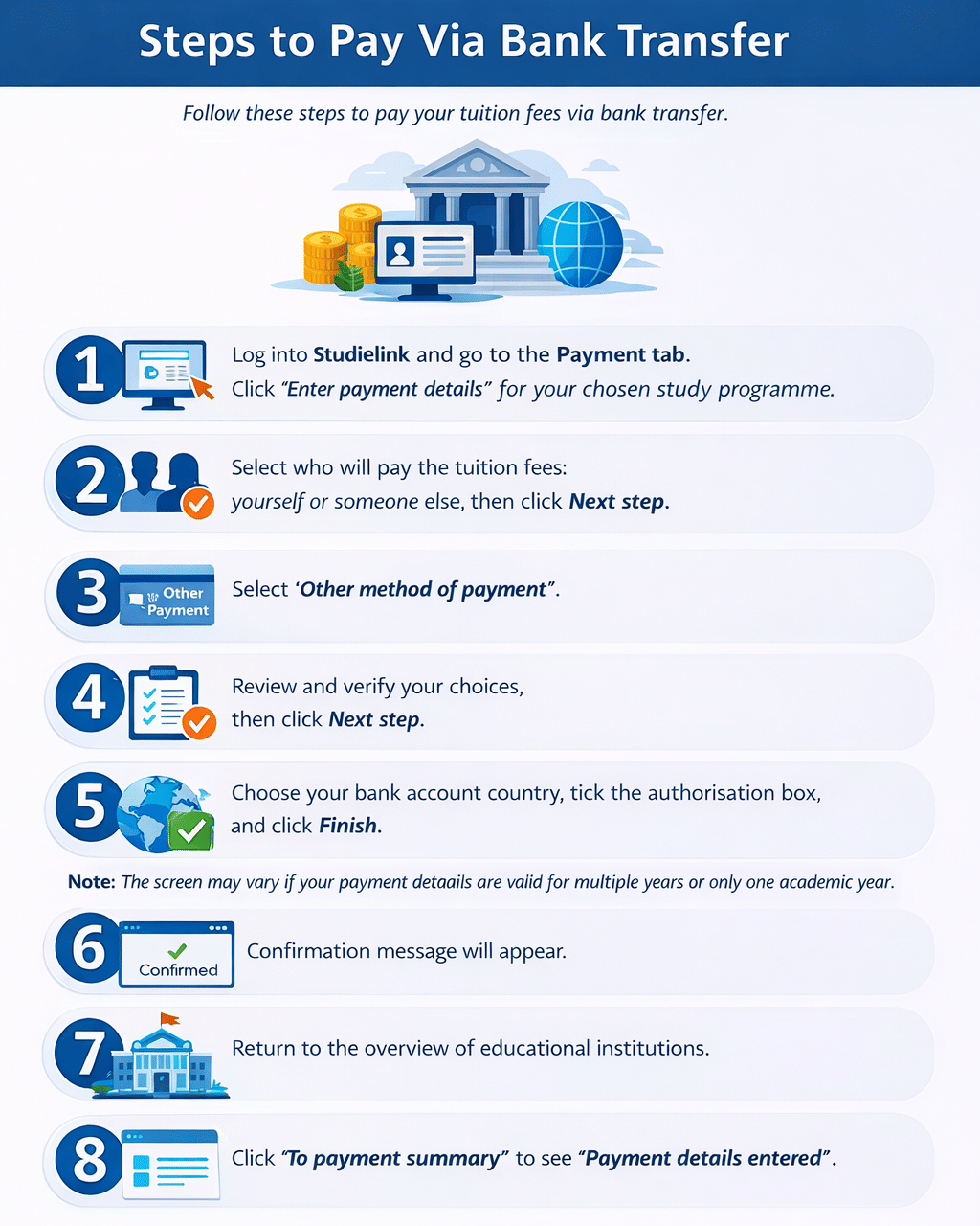 Note: After submitting your registration request in Studielink, you will be notified when it is time to enter your payment method and details.