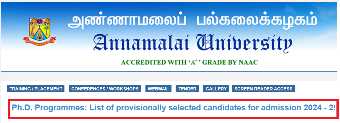 Annamalai University has published the provisional list of selected candidates on the official website for various Ph.D. programs for the 2024-2025 session. The last date of fee payment is November 8, 2024 and selected candidates must complete their payment within the specified time otherwise their admission will be cancelled. Fees can be paid online through an online payment gateway and candidates can pay the fee offline to the finance office of the Annamalai University.