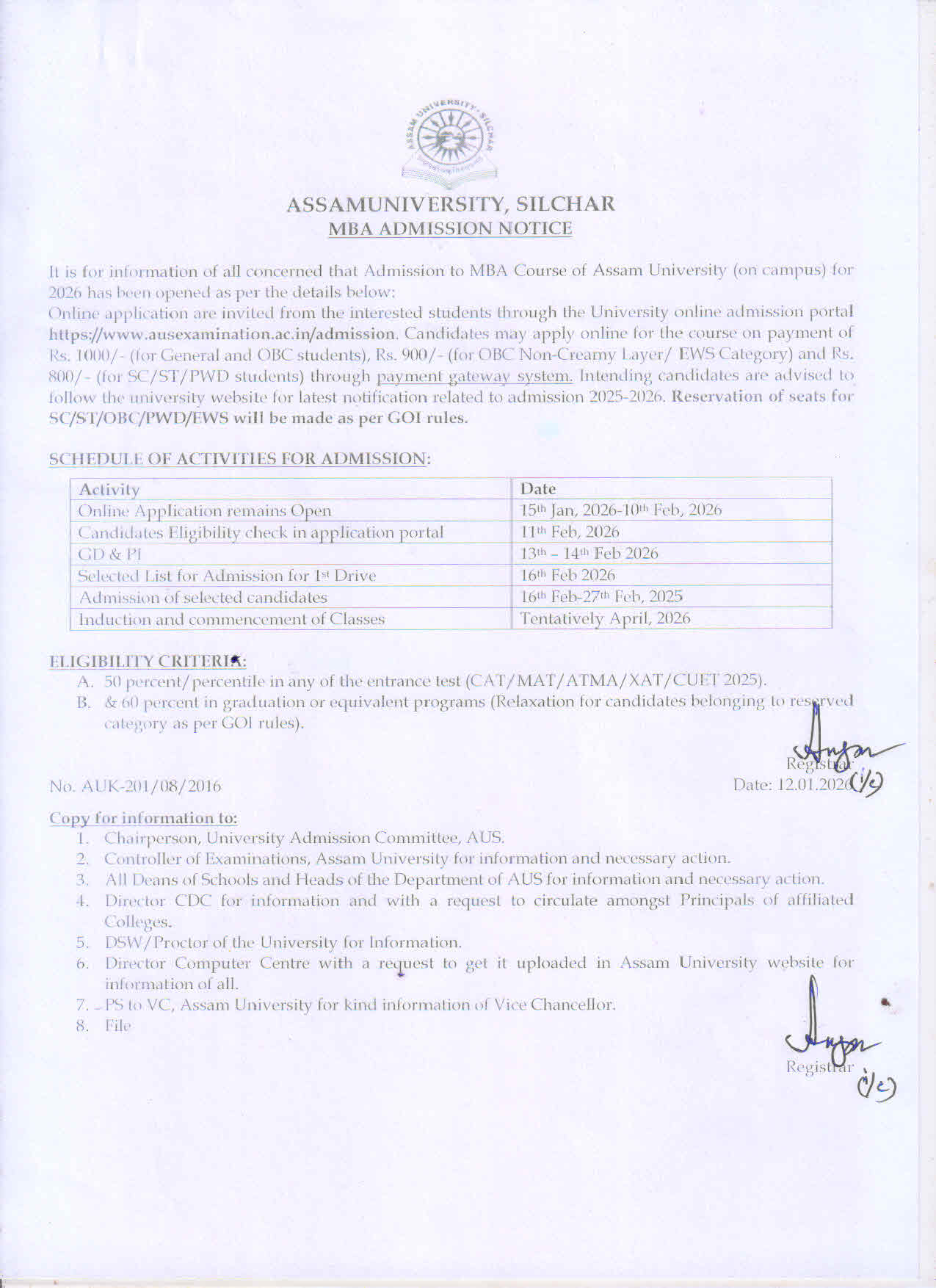 Assam University, Silchar, has released the official notification for admission to its on-campus MBA programme for the academic year 2026. According to the admission schedule, the online application window will remain open till February 10, 2026.