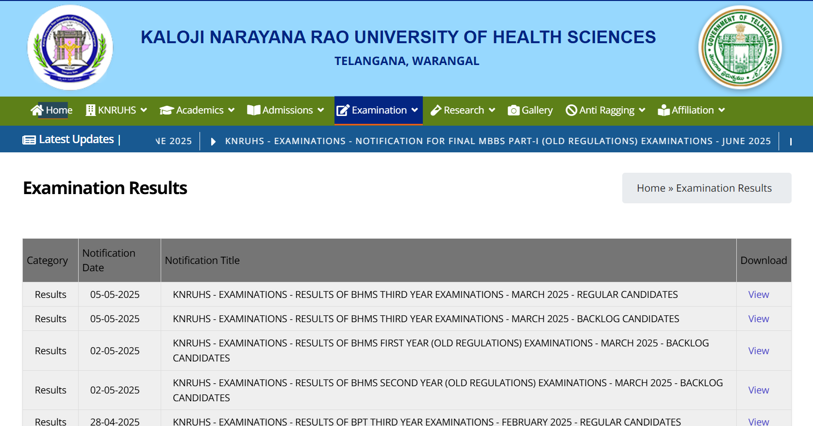 Kaloji Narayana Rao University of Health Sciences (KNRUHS) released the results of various semester examinations on its official website. The students can now check and download the results for their respective courses on the KNRUHS Official Website.
