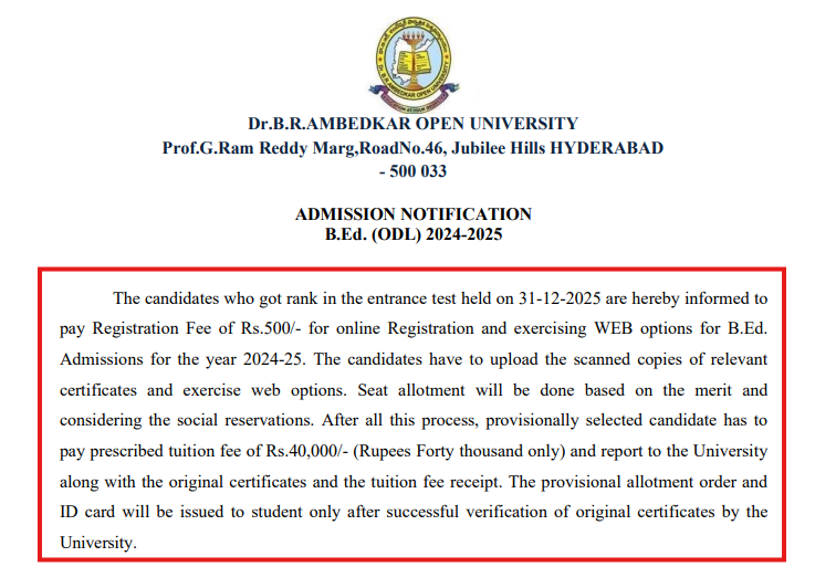 Dr. B R Ambedkar Open University has released admission notification for the B.Ed (ODL) program for 2025. The students who got ranked in the entrance test have to submit documents online along with a registration fee of INR 500. The final selection list will be prepared on a merit basis. Provisionally selected candidates will have to pay a tuition fee of INR 40,000 to secure their admission. Interested candidates can check the notification released by the university from the link given below.
