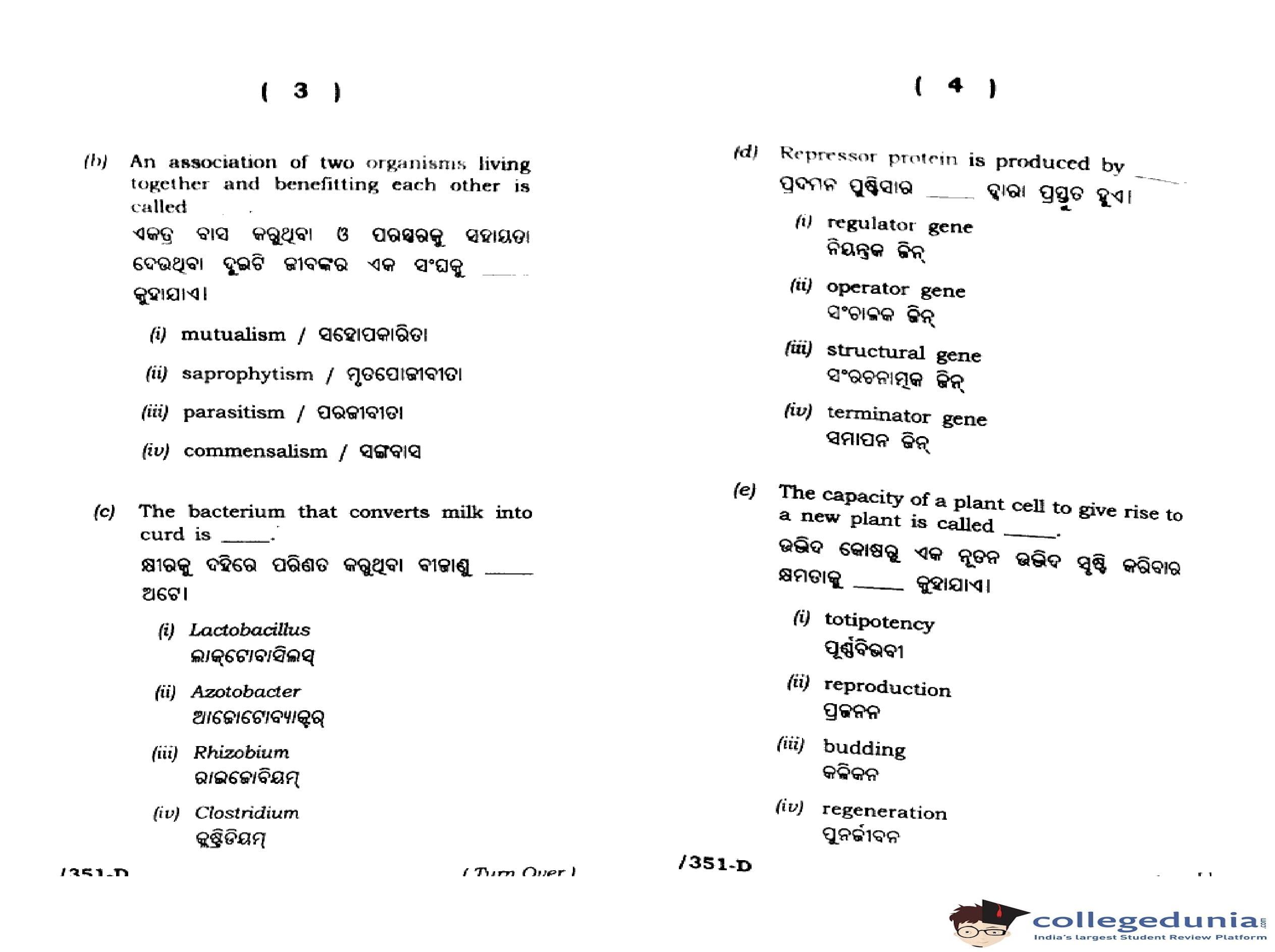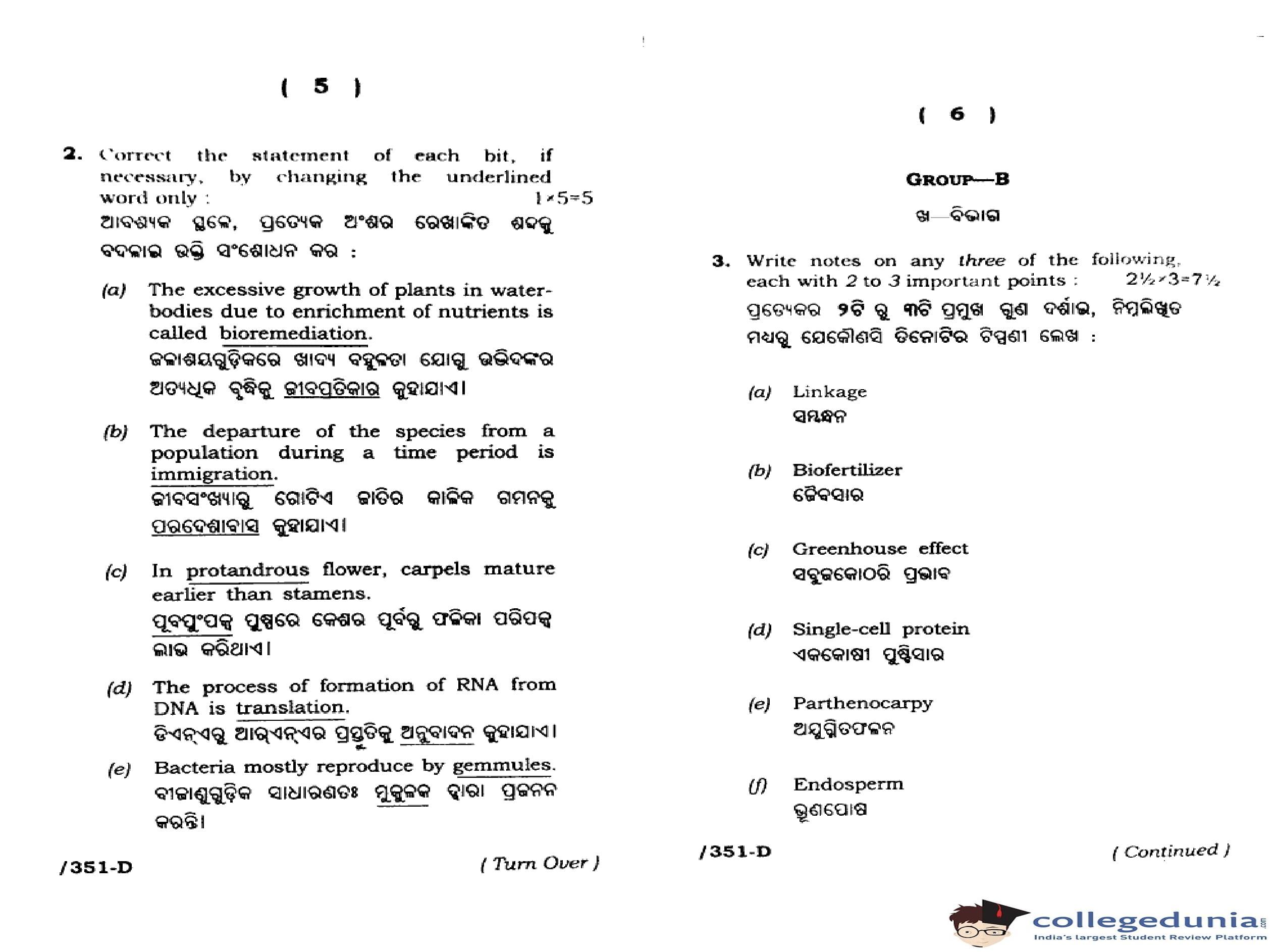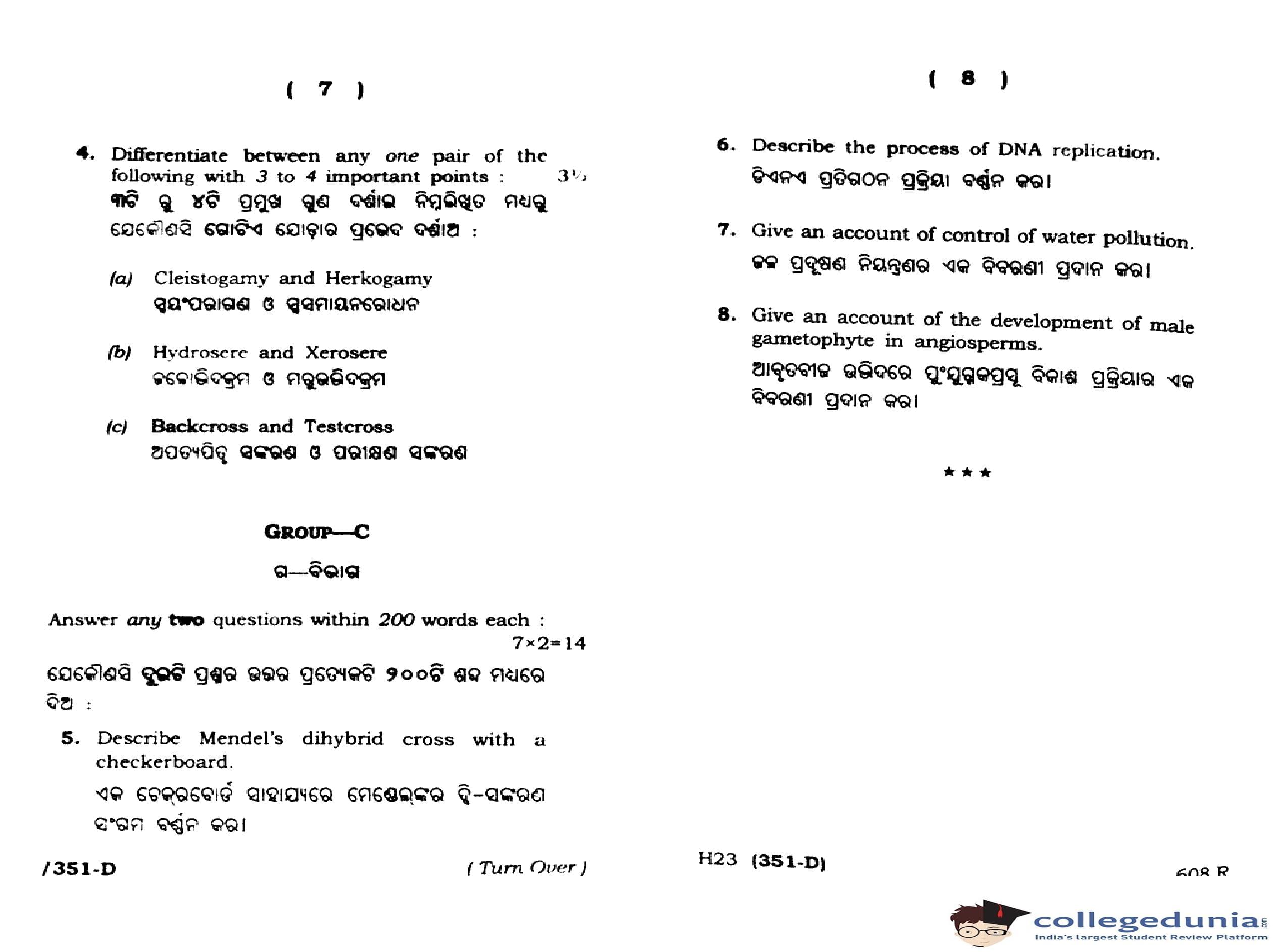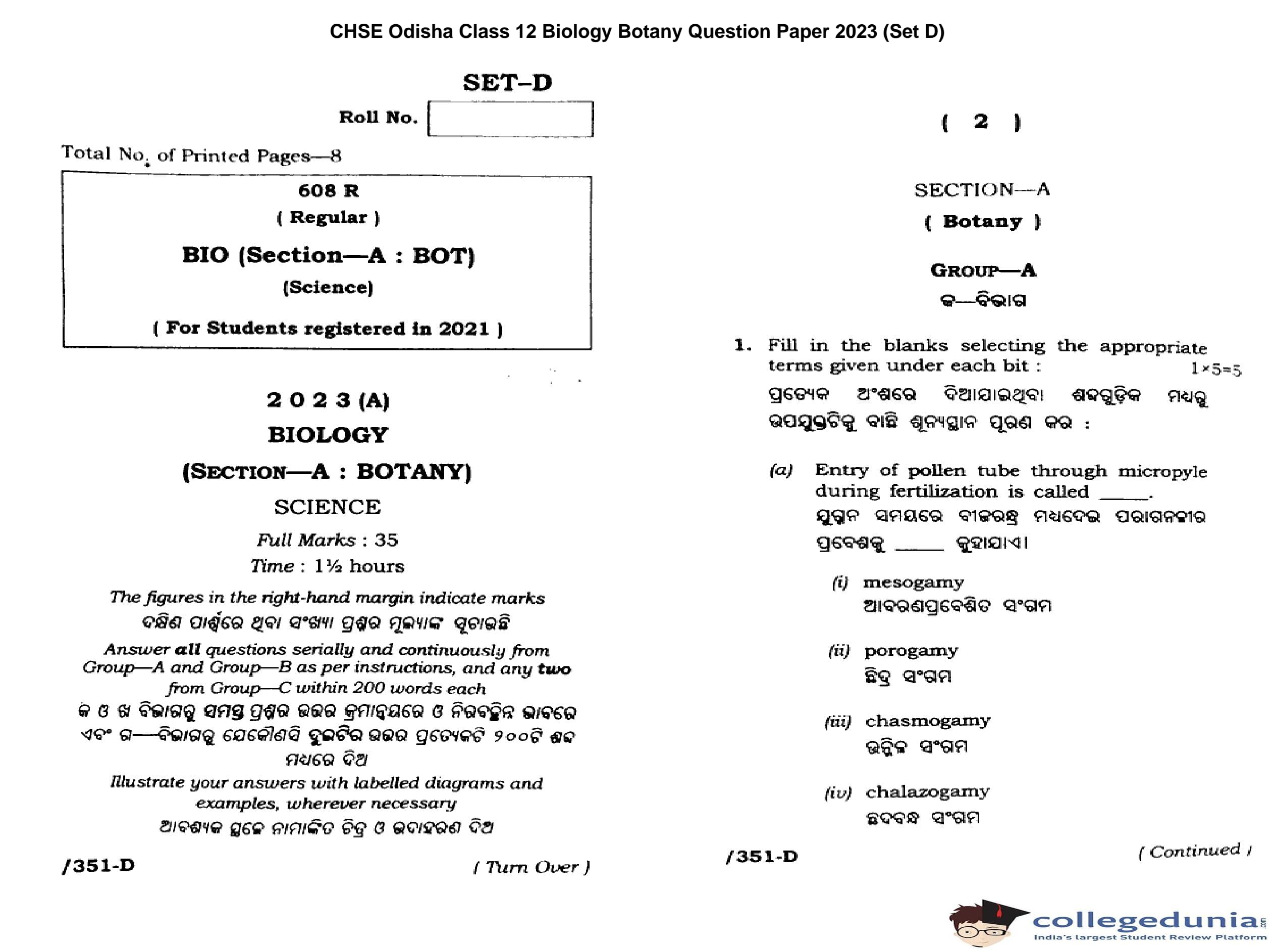 CHSE Odisha Class 12 Biology Botany (Set D) Question Paper 2023 with Answer Key