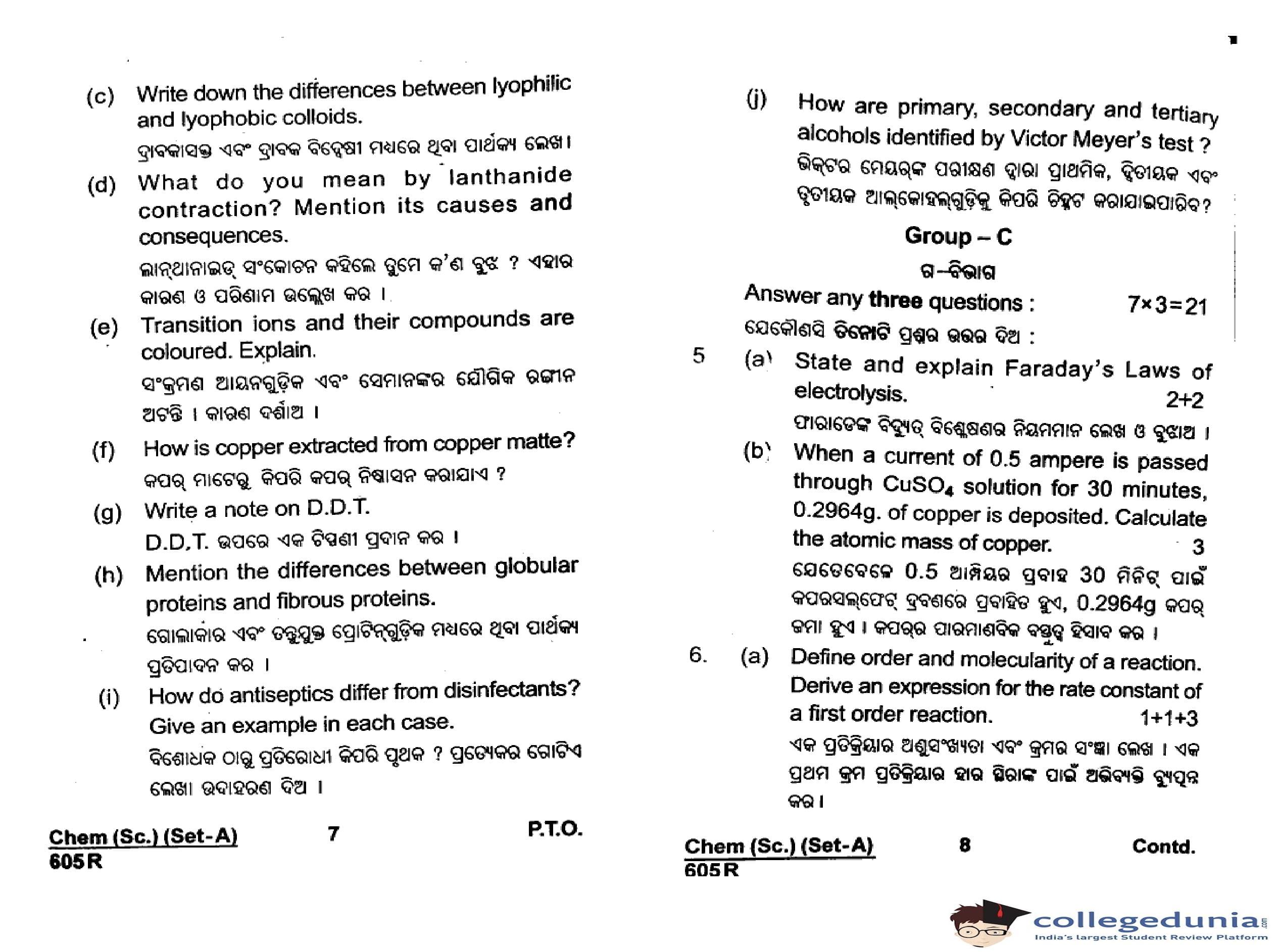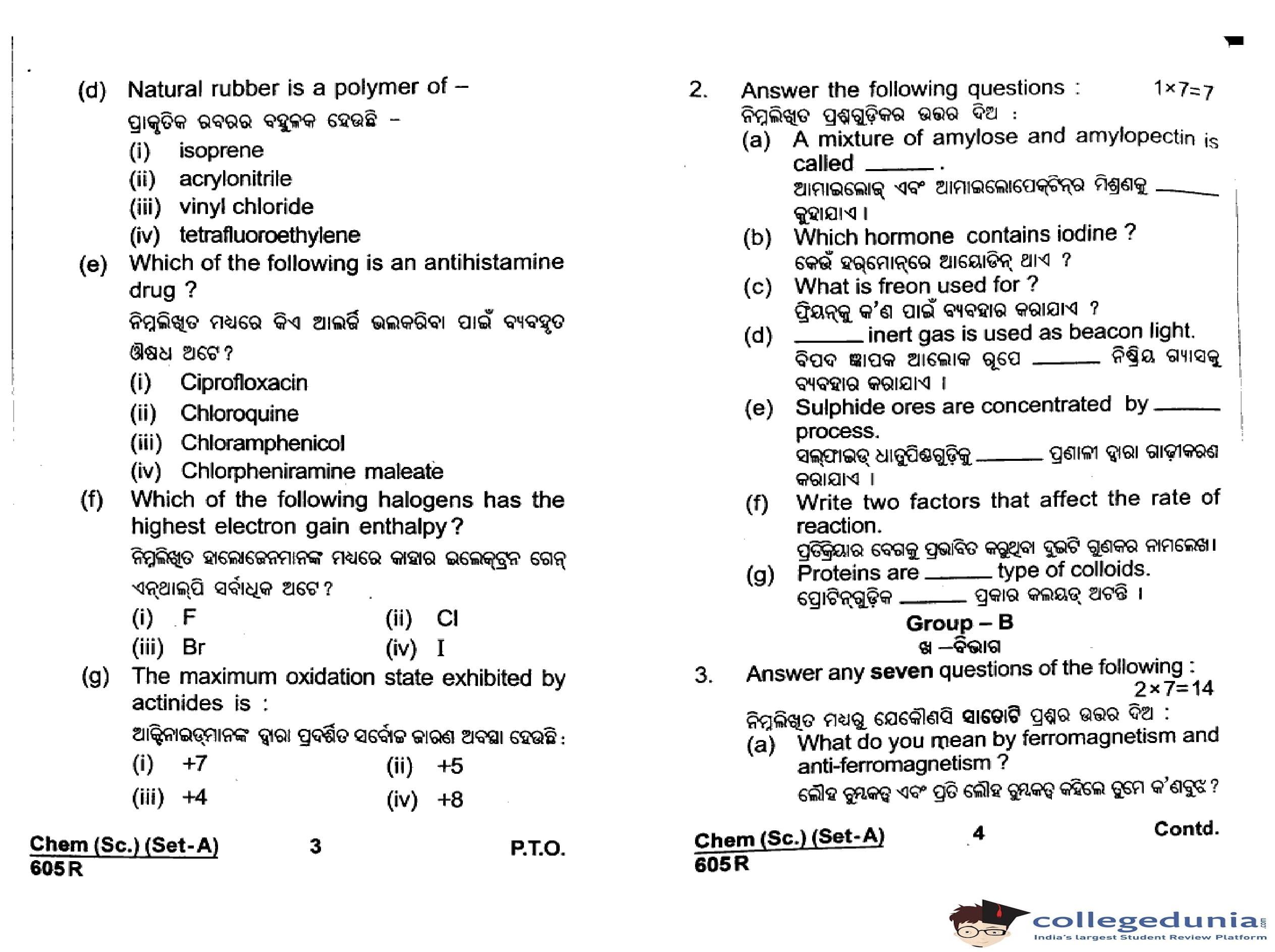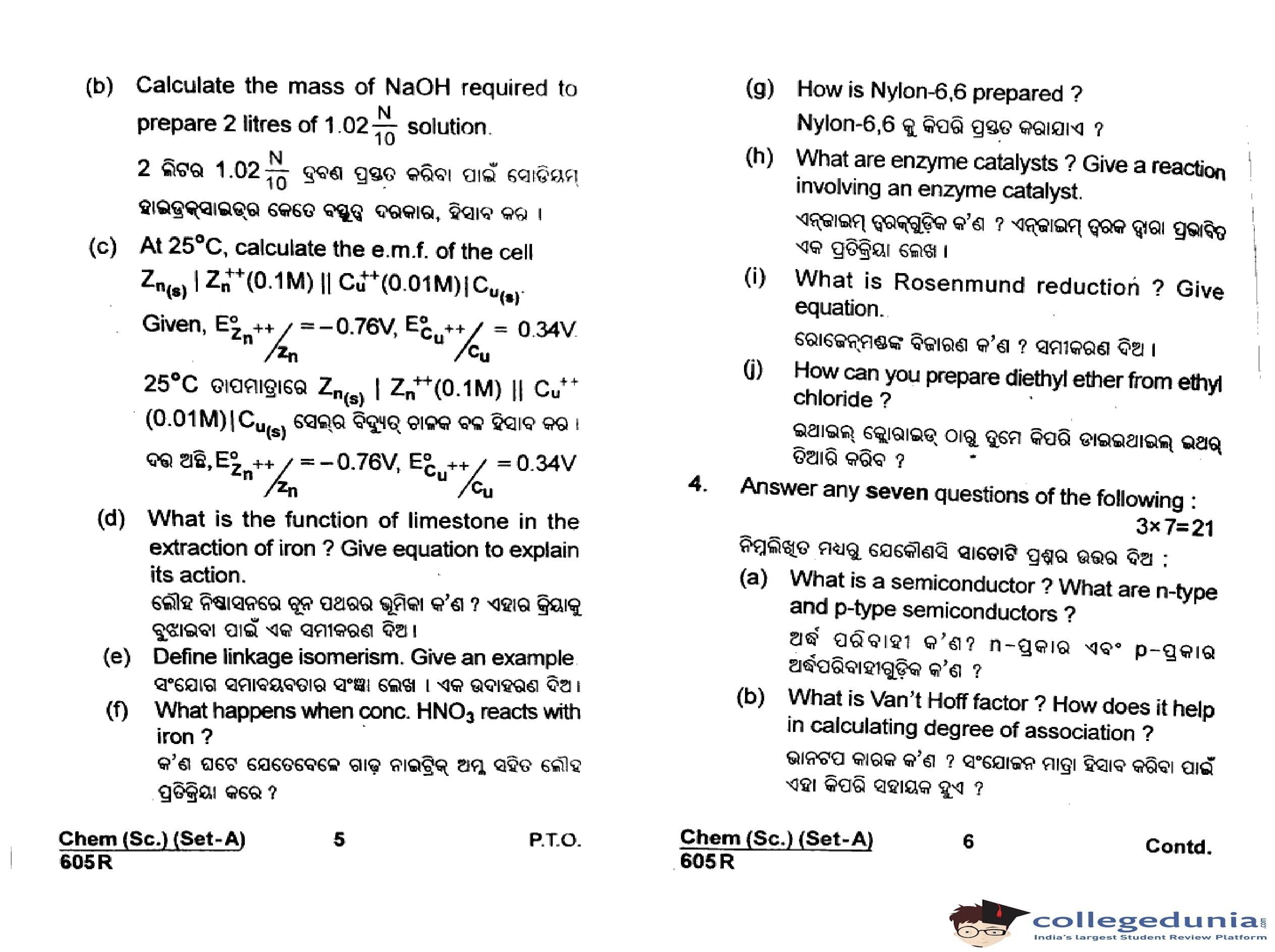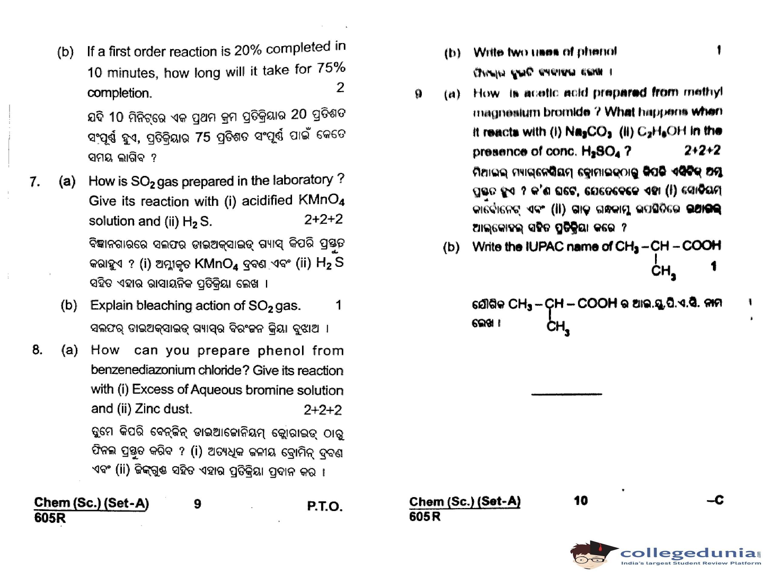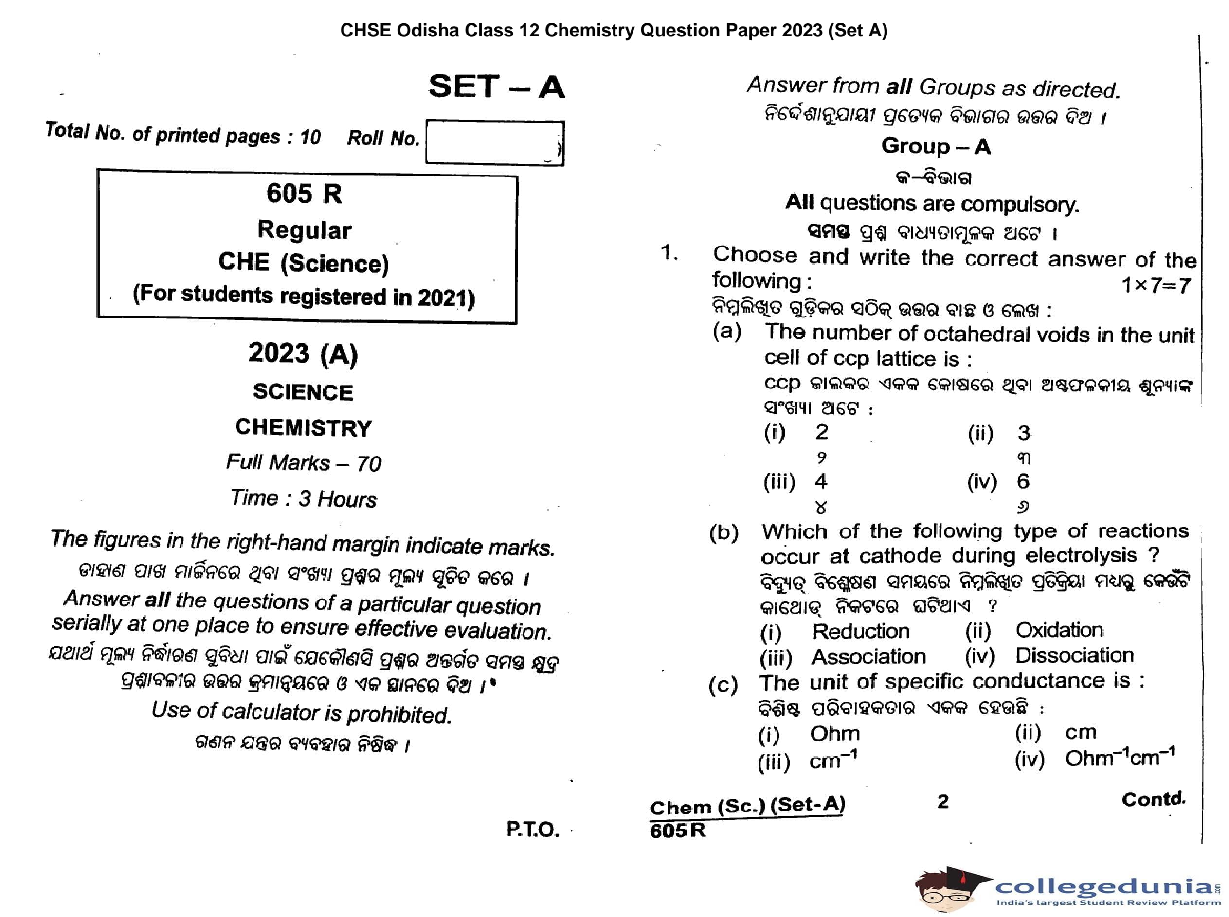 CHSE Odisha Class 12 Chemistry (Set A) Question Paper 2023 with Answer Key