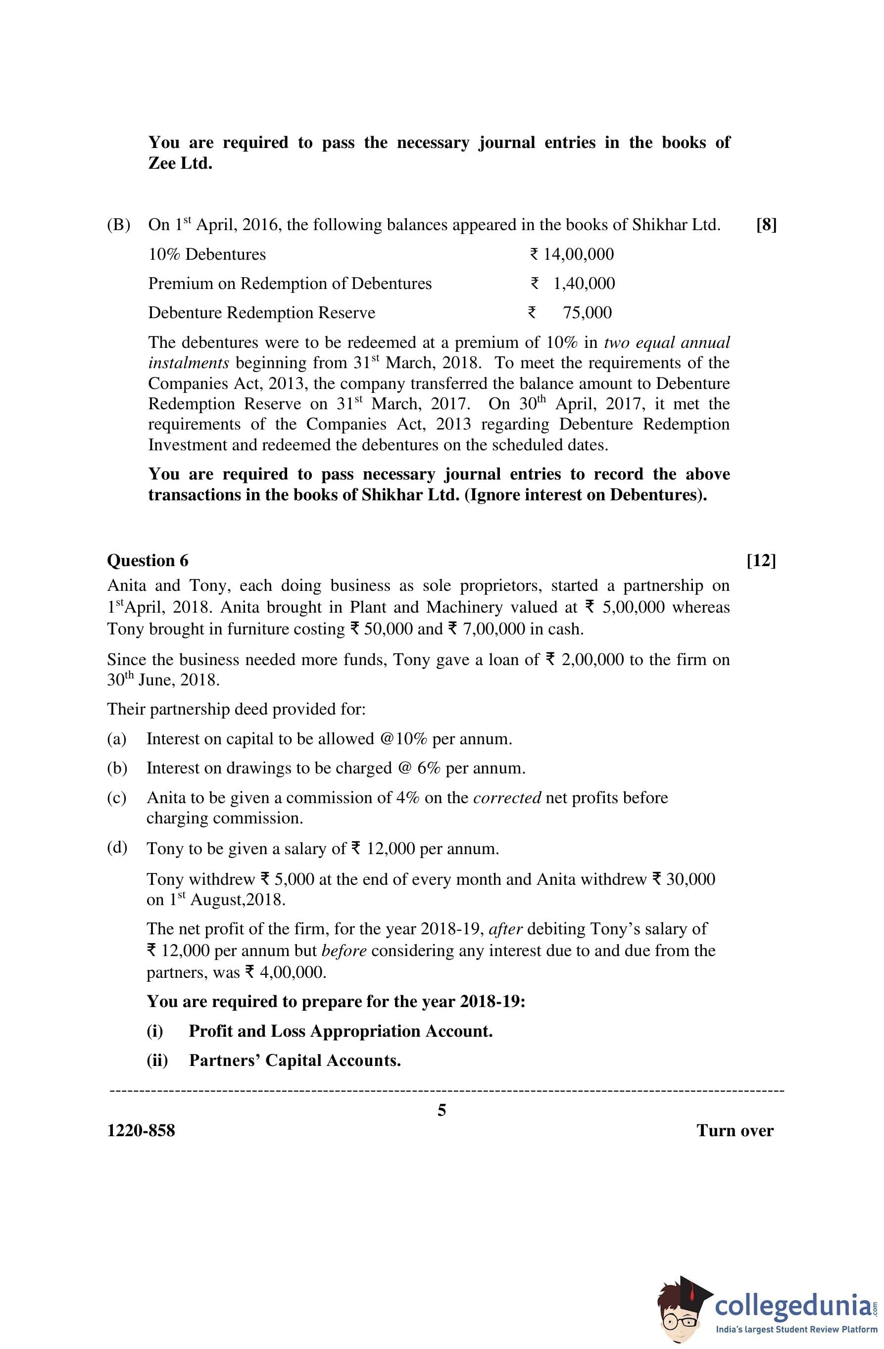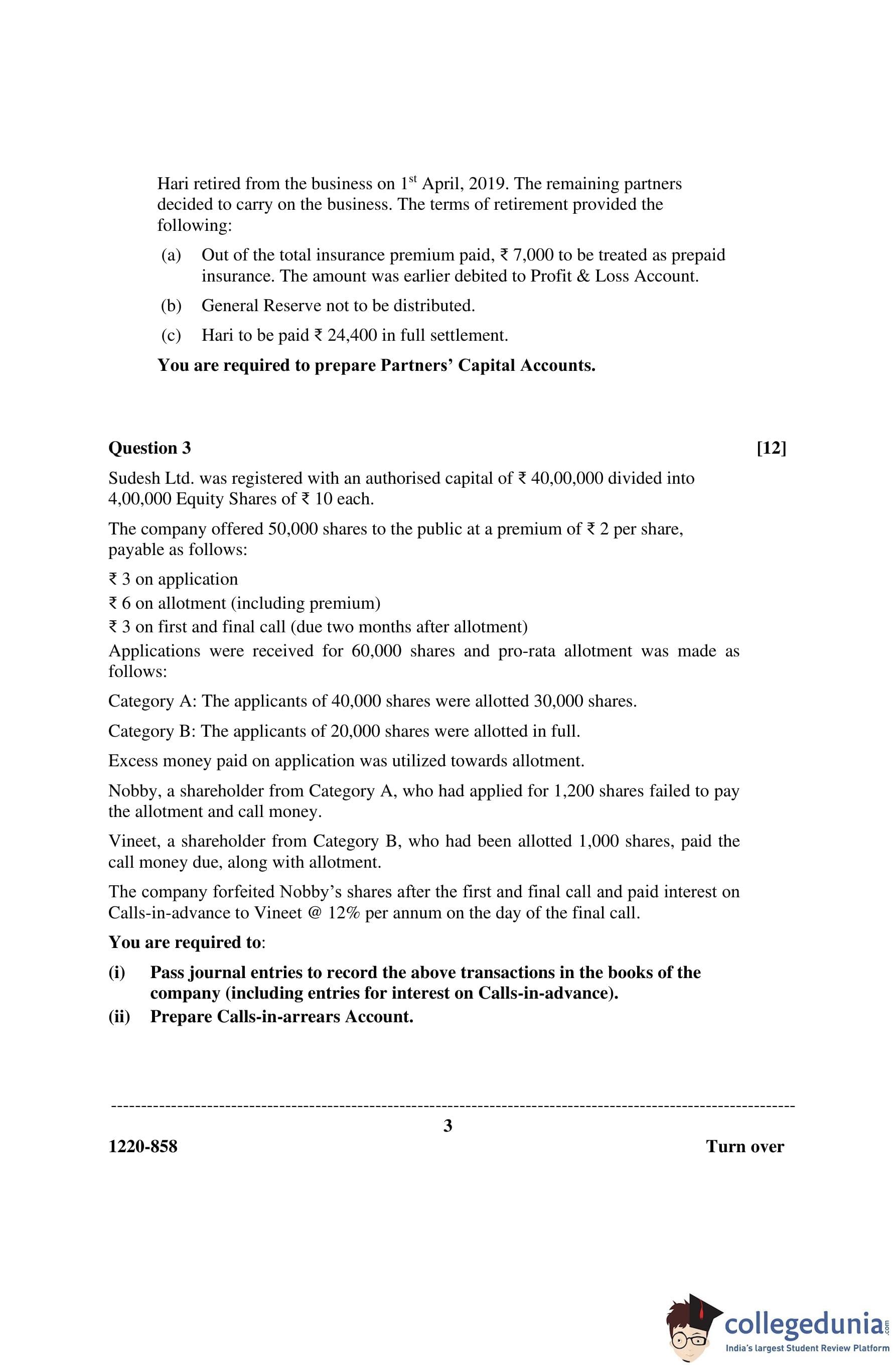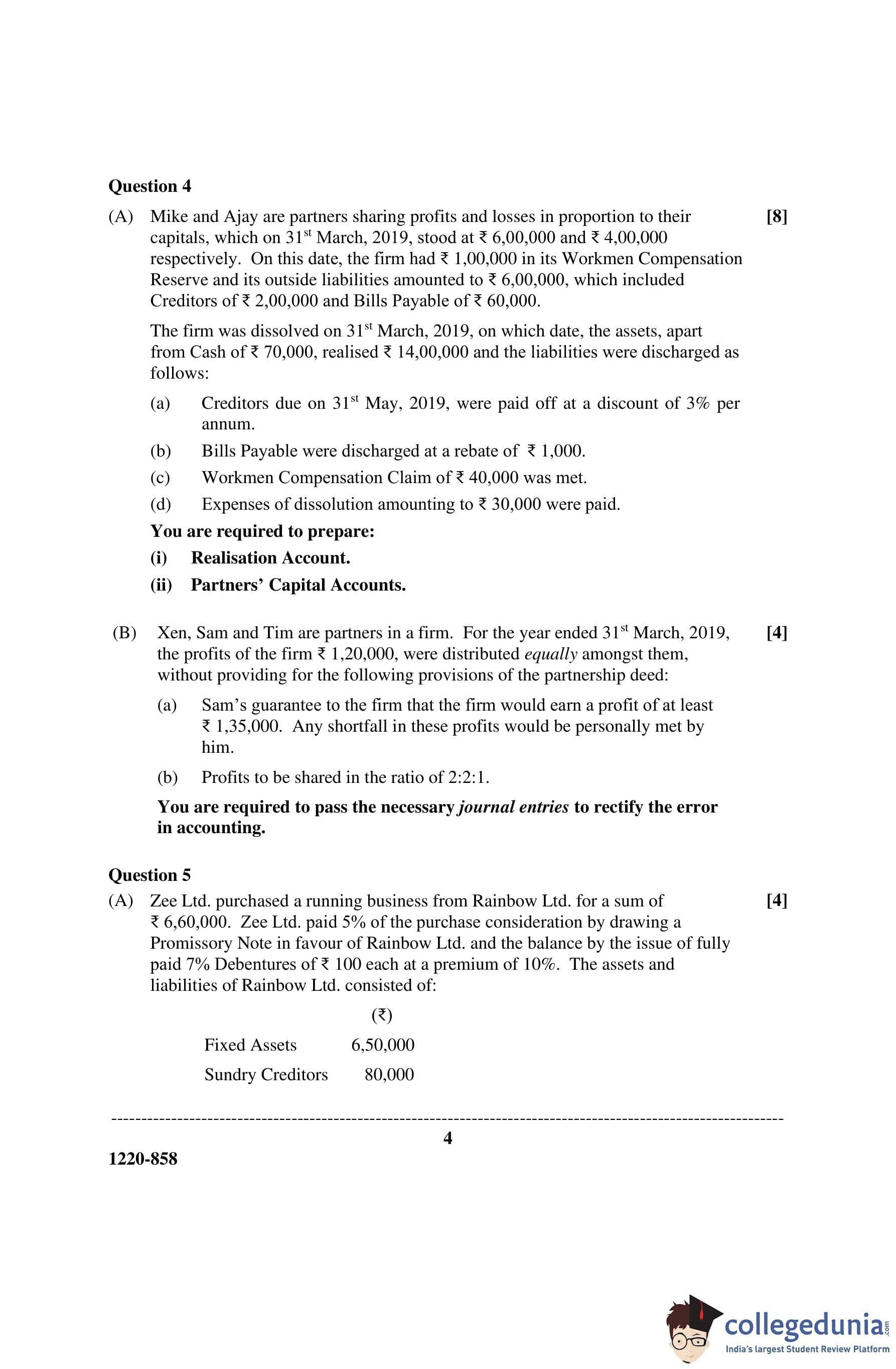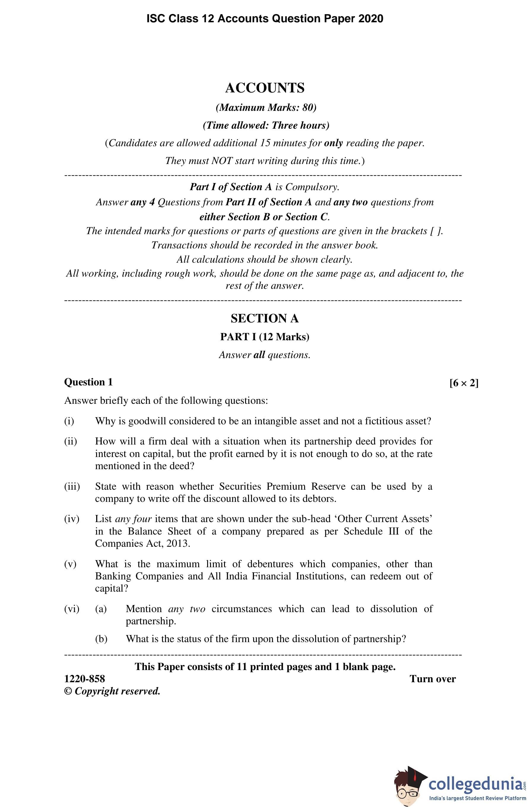 ISC Class 12 Accounts Question Paper 2020 with Answer Key