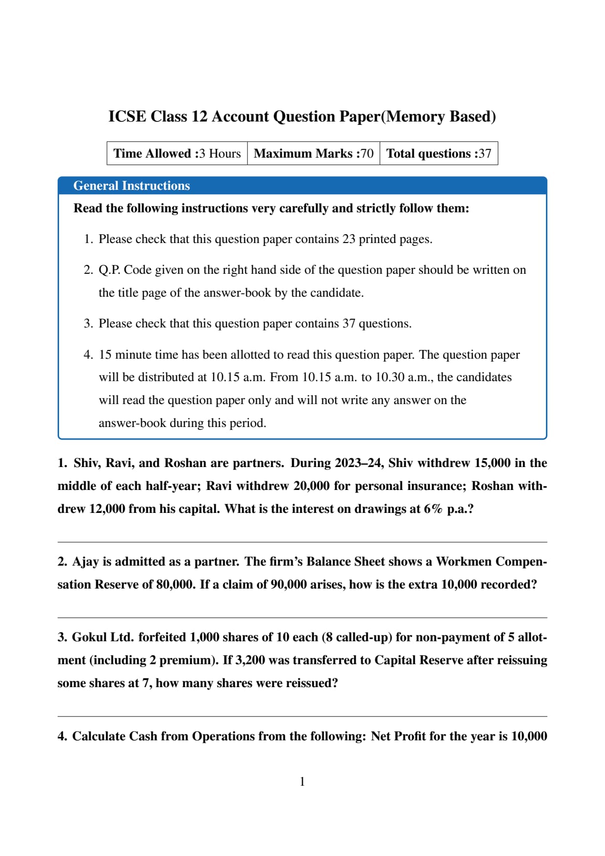 ISC Class 12 Accounts Question Paper 2026 with Solution PDF (Memory based)