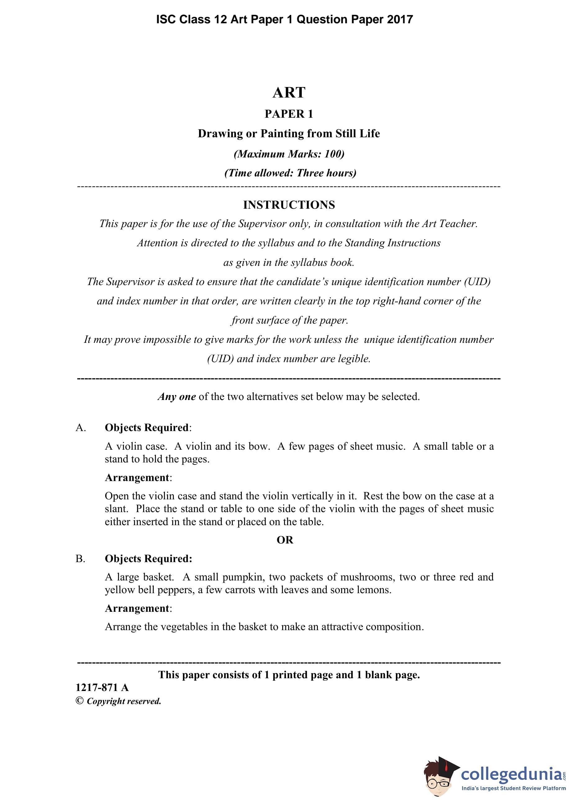 ISC Class 12 Art Paper 1 Question Paper 2017 with Answer Key