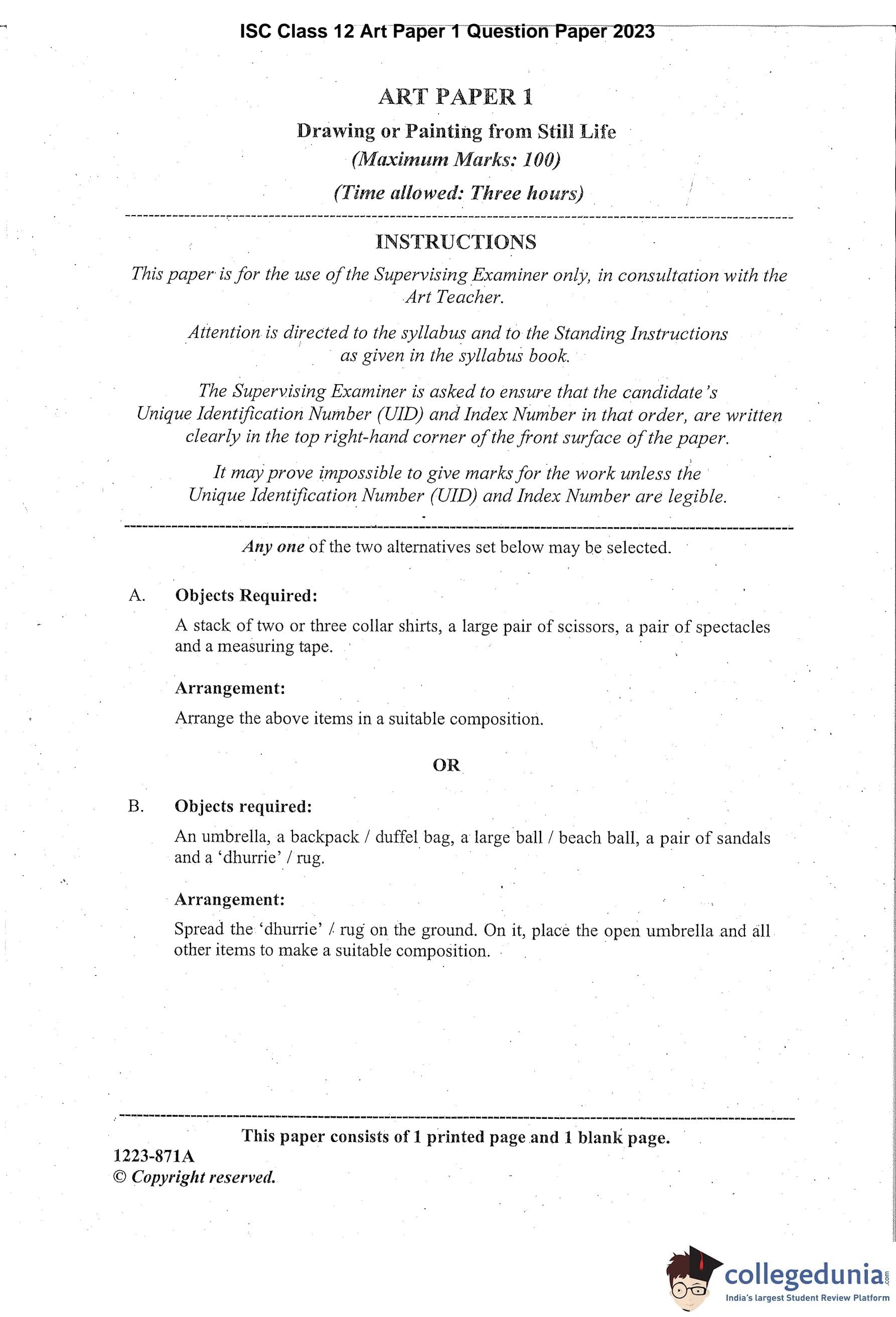 | ISC Class 12 Art Question Paper 2023 PDF | ISC Class 12 Art Answer Key 2023 PDF |