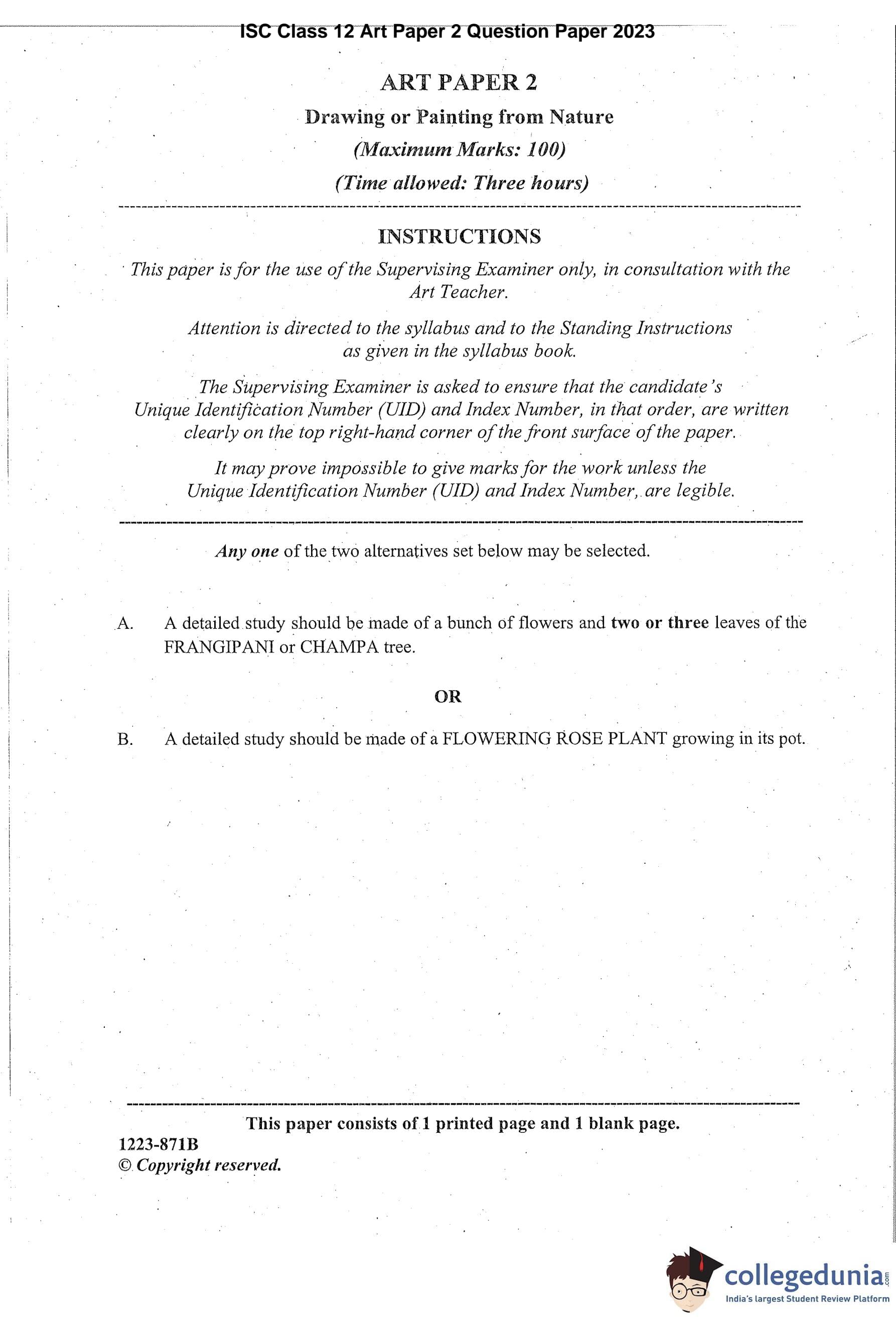 ISC Class 12 Art Paper 2 Question Paper 2023 with Answer Key