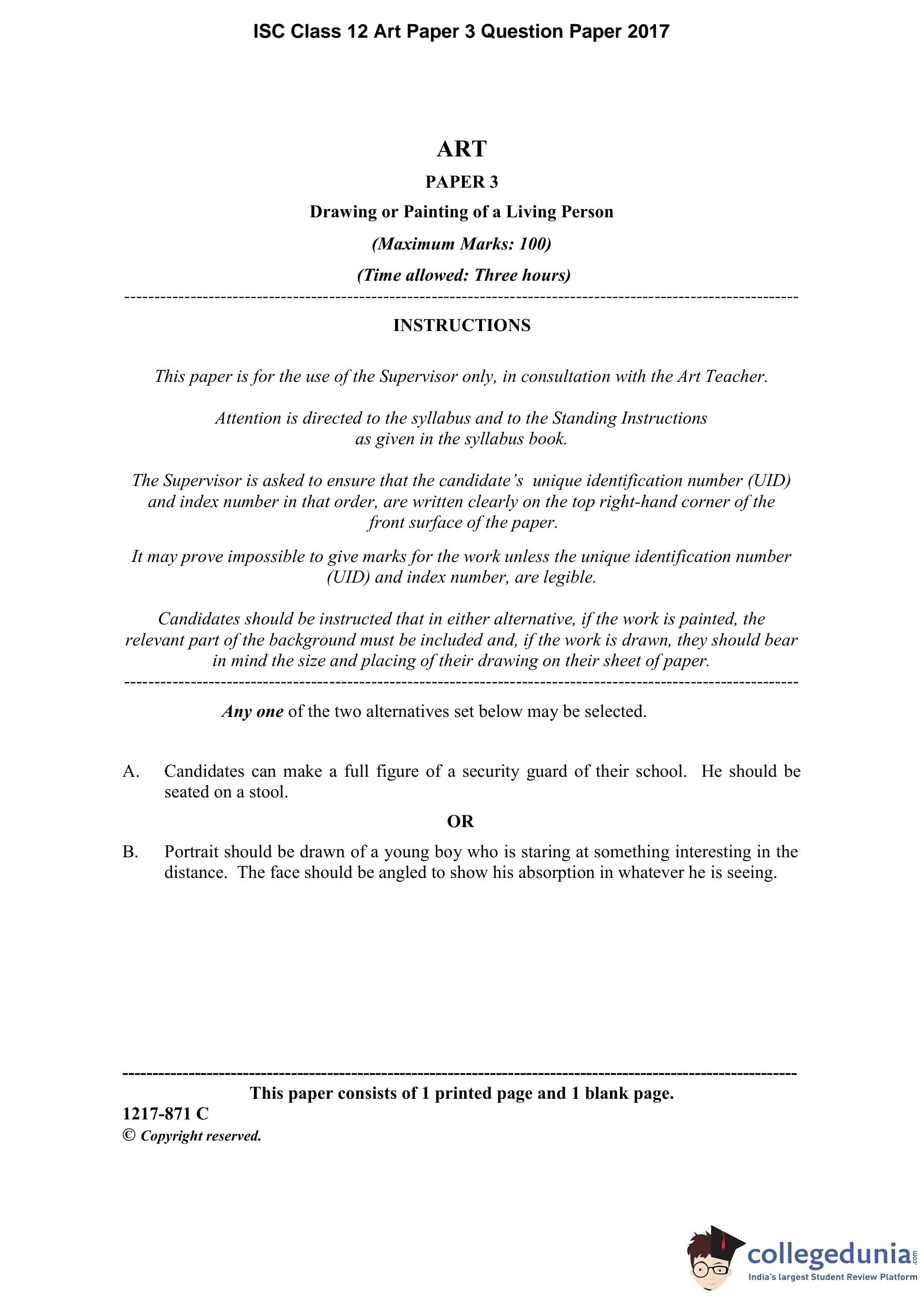 ISC Class 12 Art Paper 3 Question Paper 2017 with Answer Key