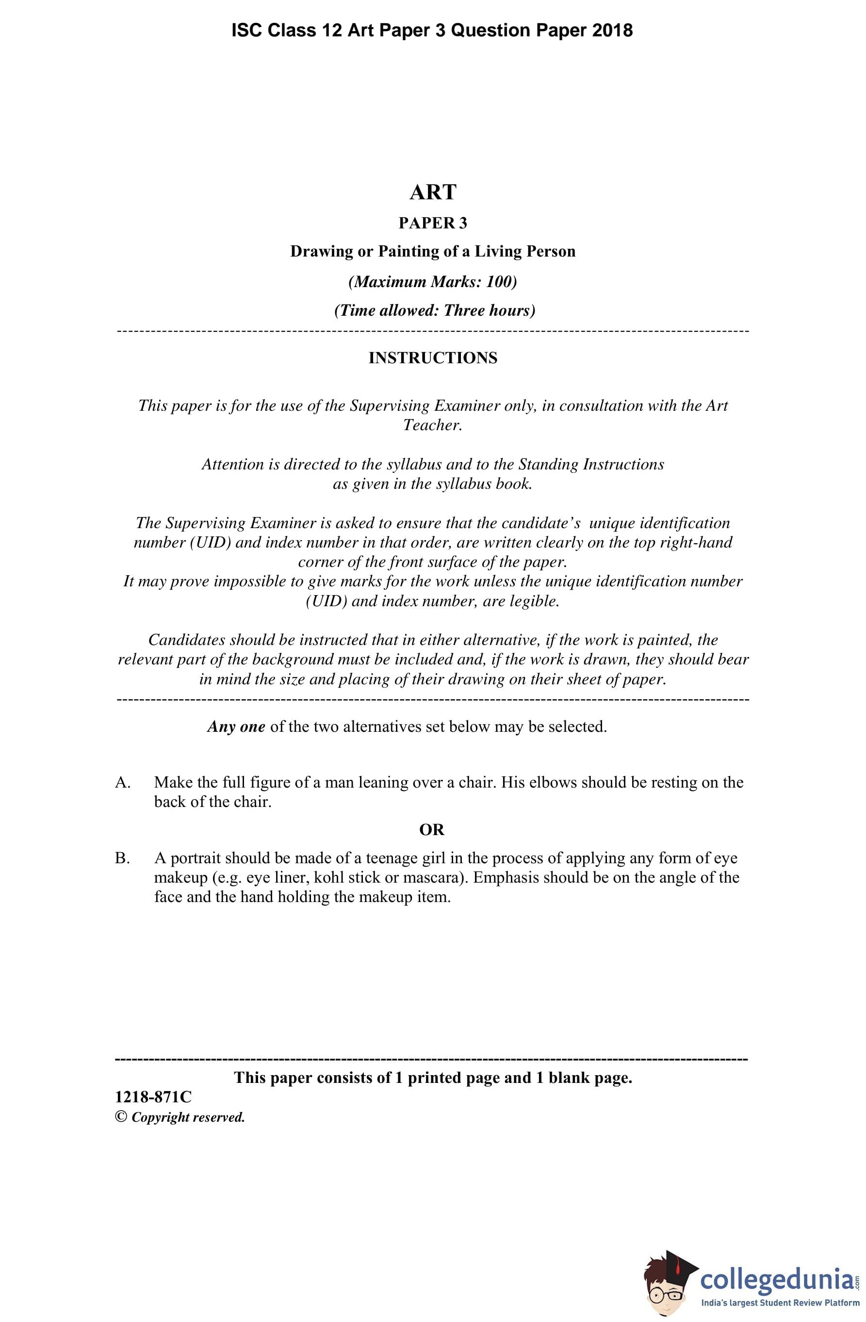 ISC Class 12 Art Paper 3 Question Paper 2018 with Answer Key