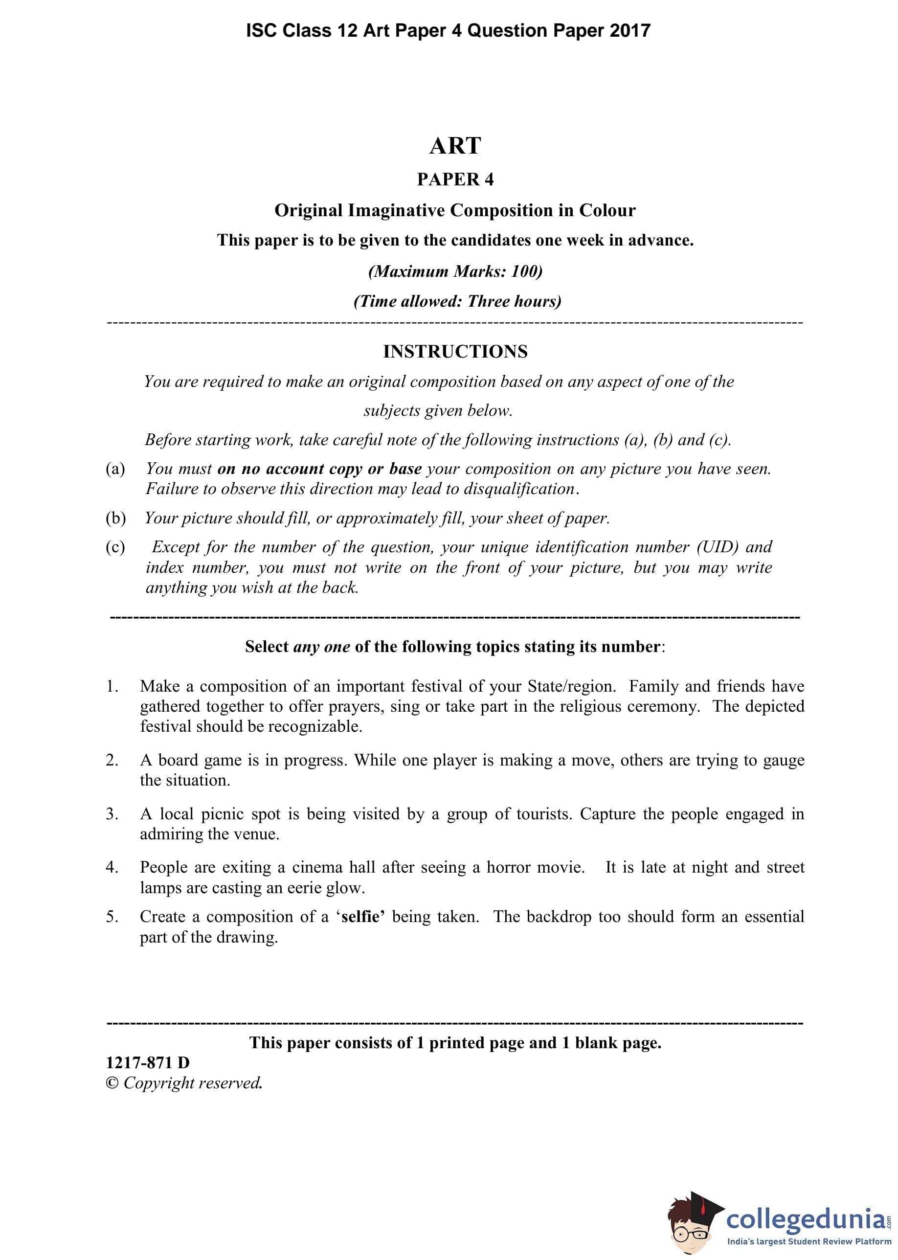 ISC Class 12 Art Paper 4 Question Paper 2017 with Answer Key