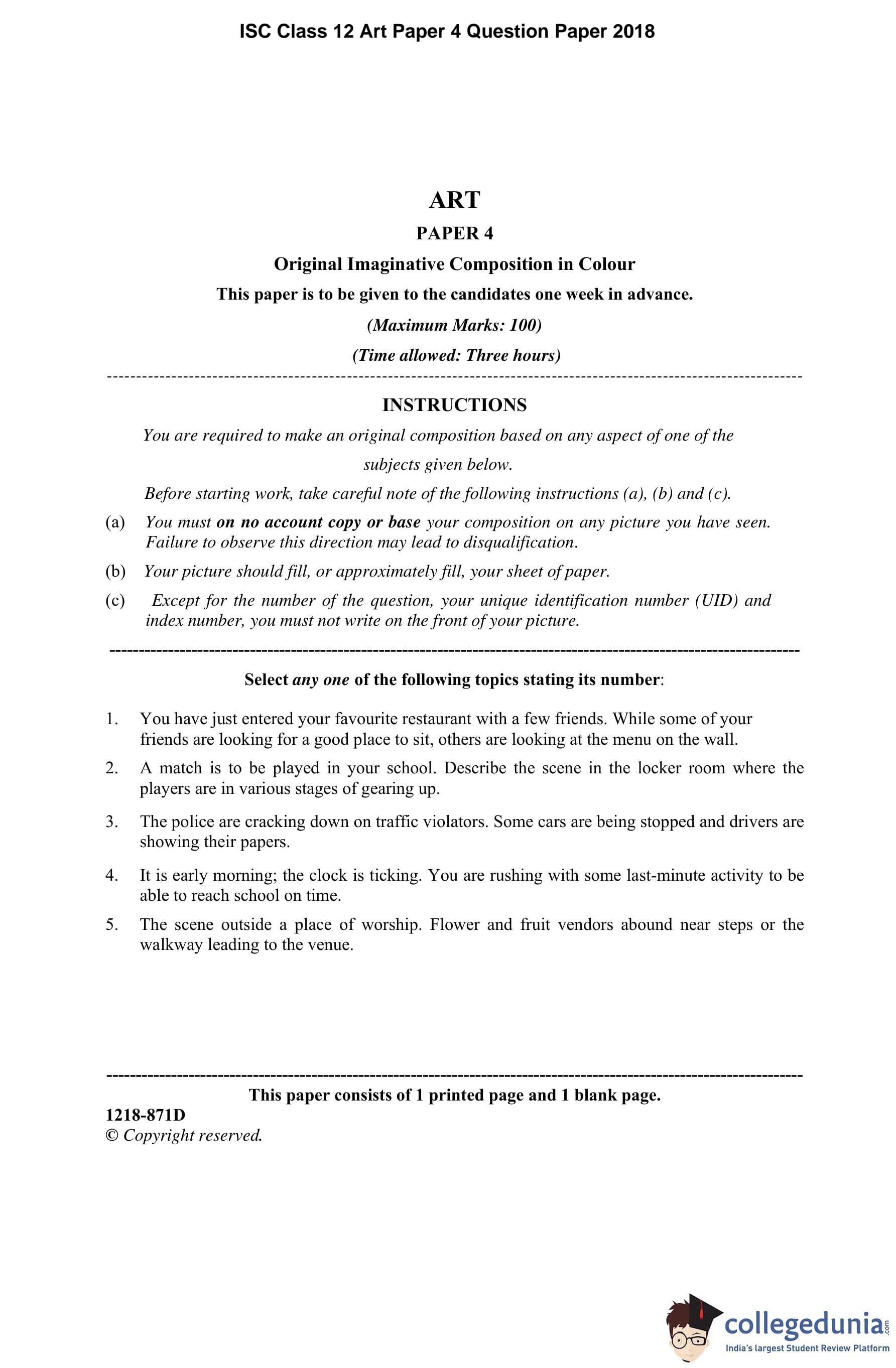 ISC Class 12 Art Paper 4 Question Paper 2018 with Answer Key