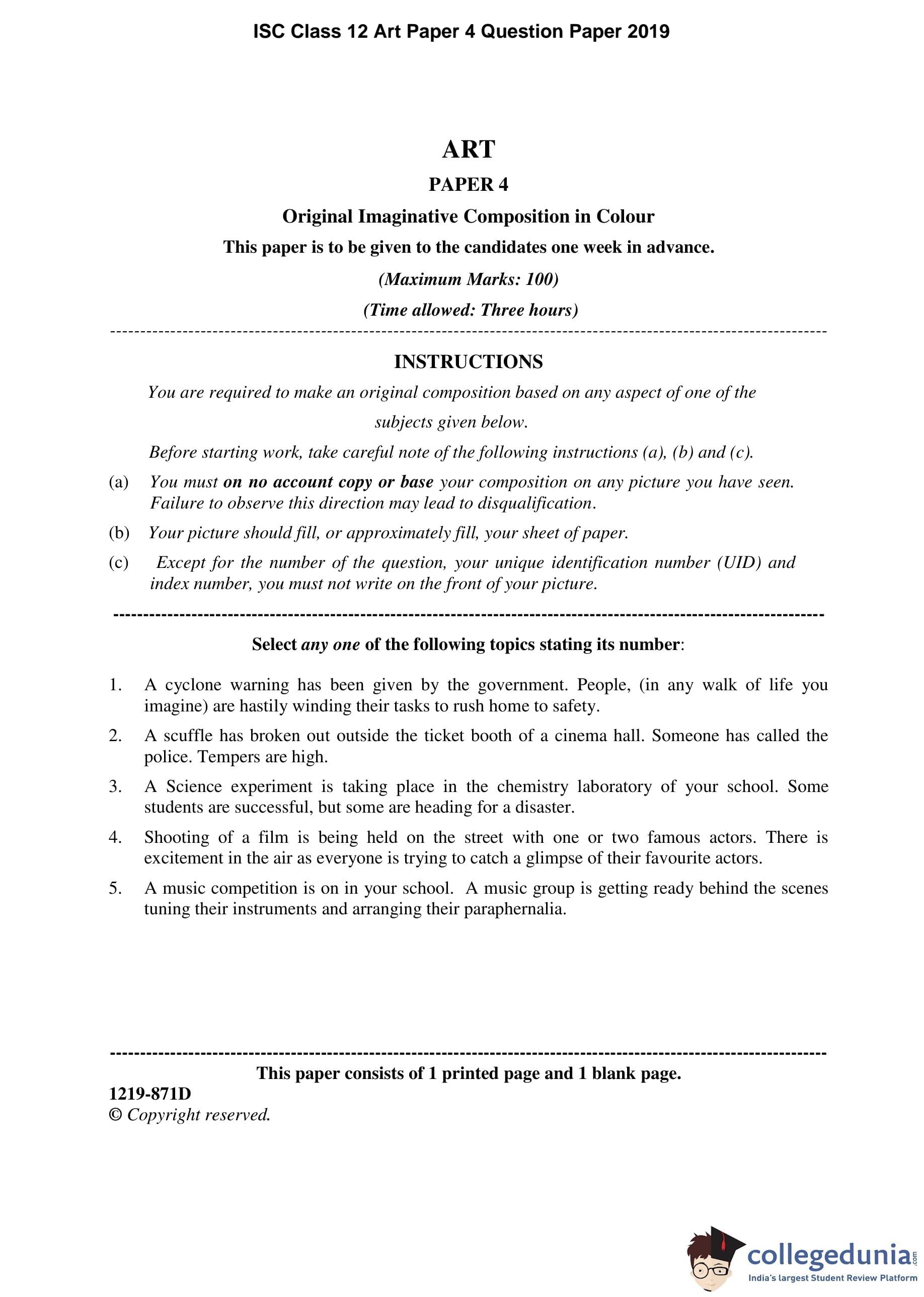 ISC Class 12 Art Paper 4 Question Paper 2019 with Answer Key