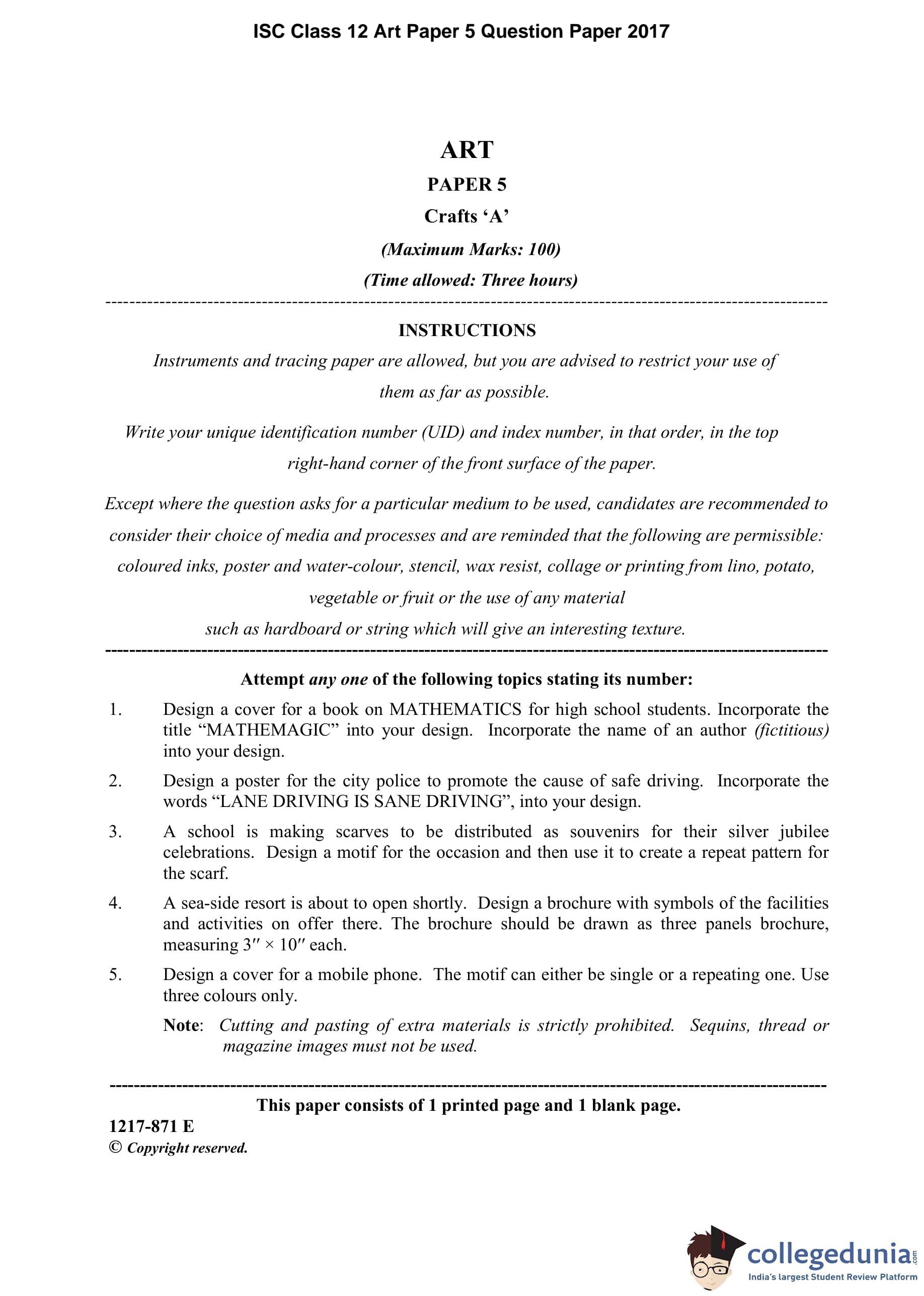 ISC Class 12 Art Paper 5 Question Paper 2017 with Answer Key
