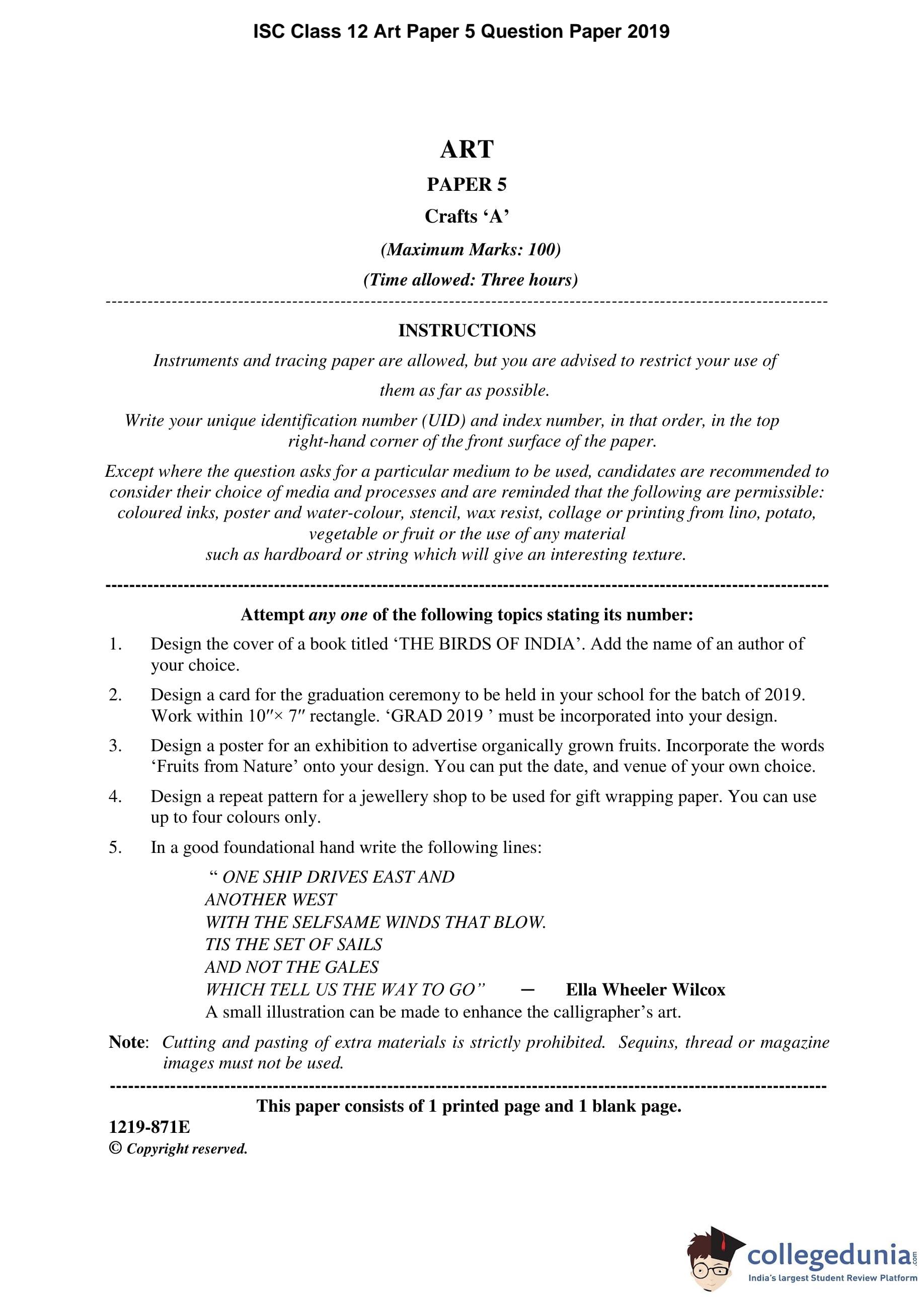 ISC Class 12 Art Paper 5 Question Paper 2019 with Answer Key
