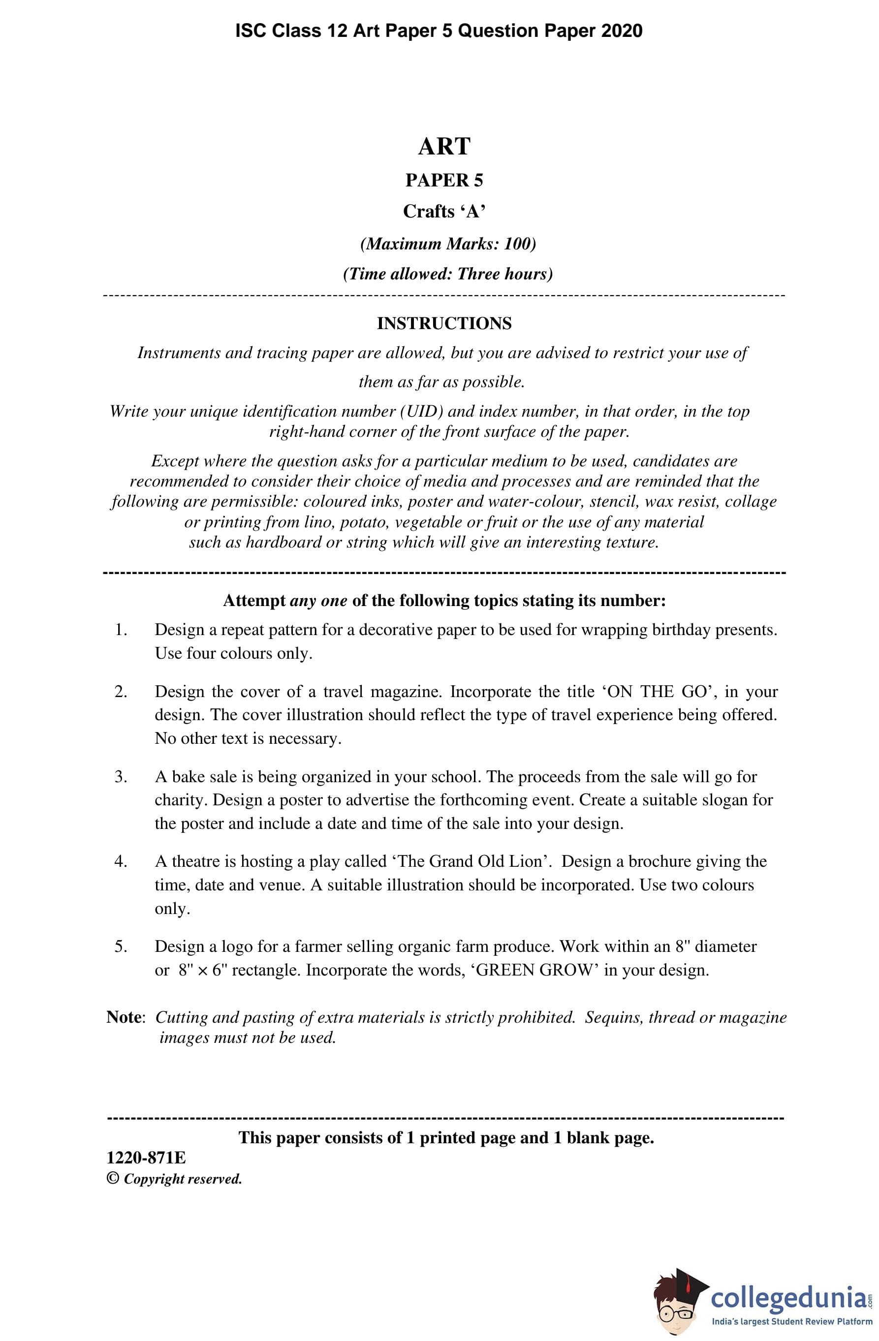 ISC Class 12 Art Paper 5 Question Paper 2020 with Answer Key