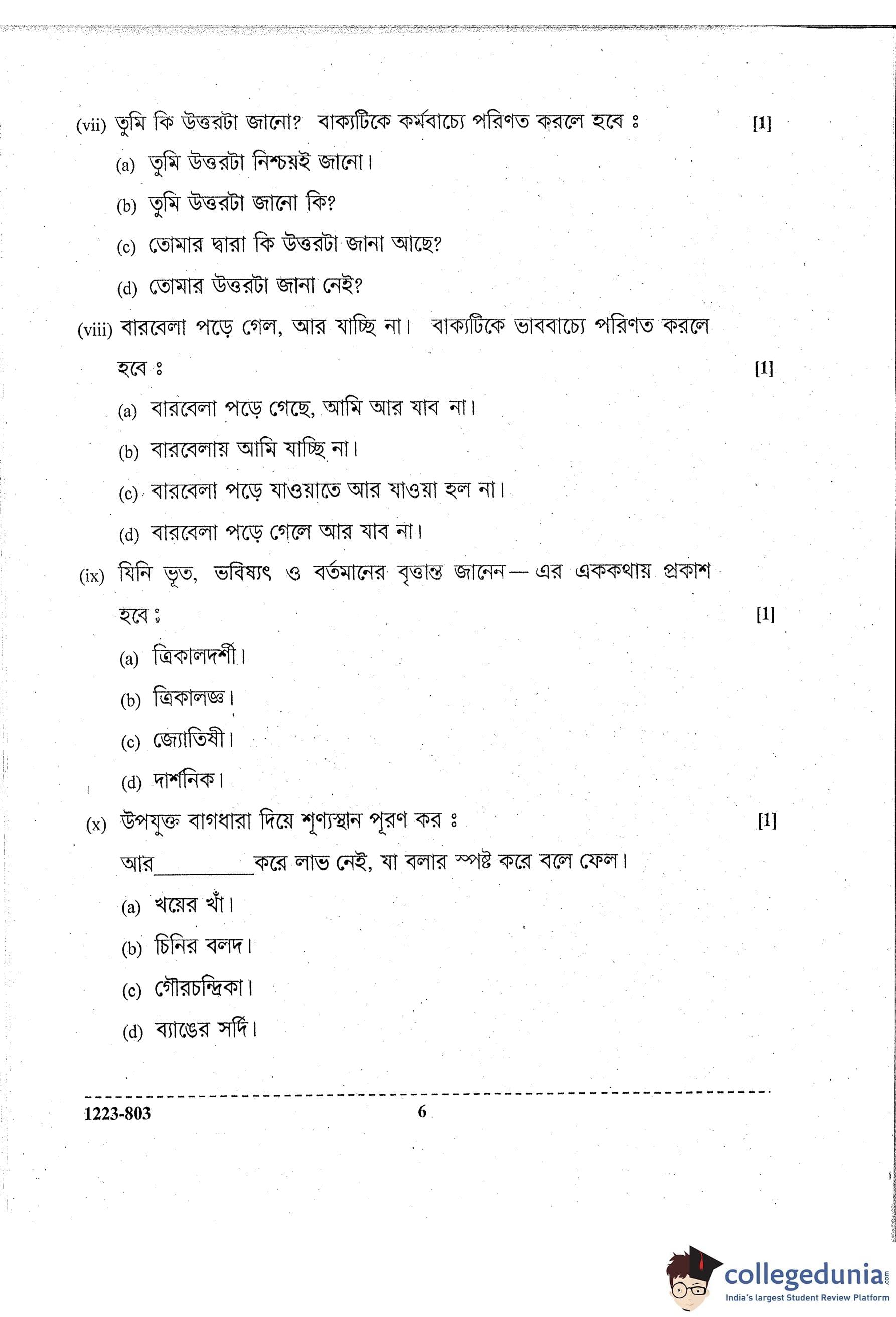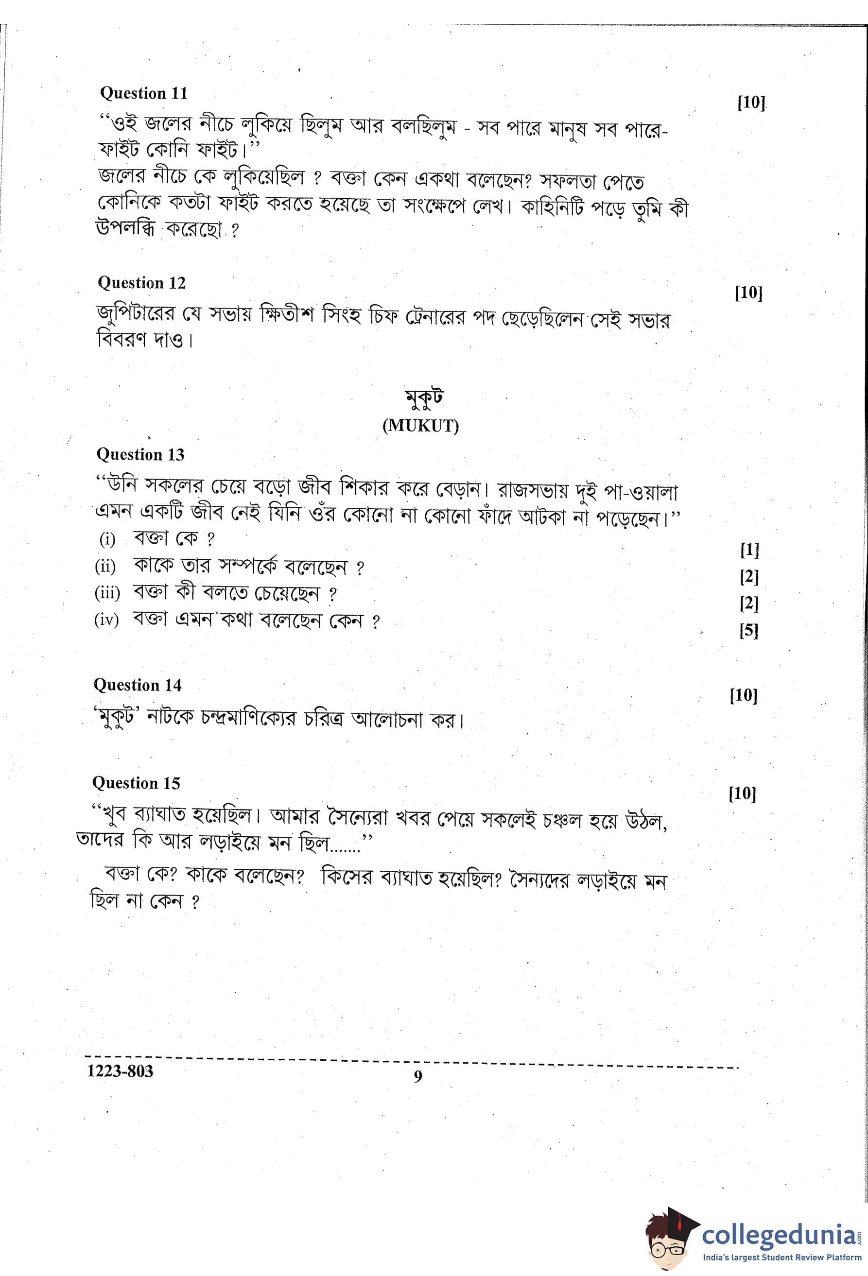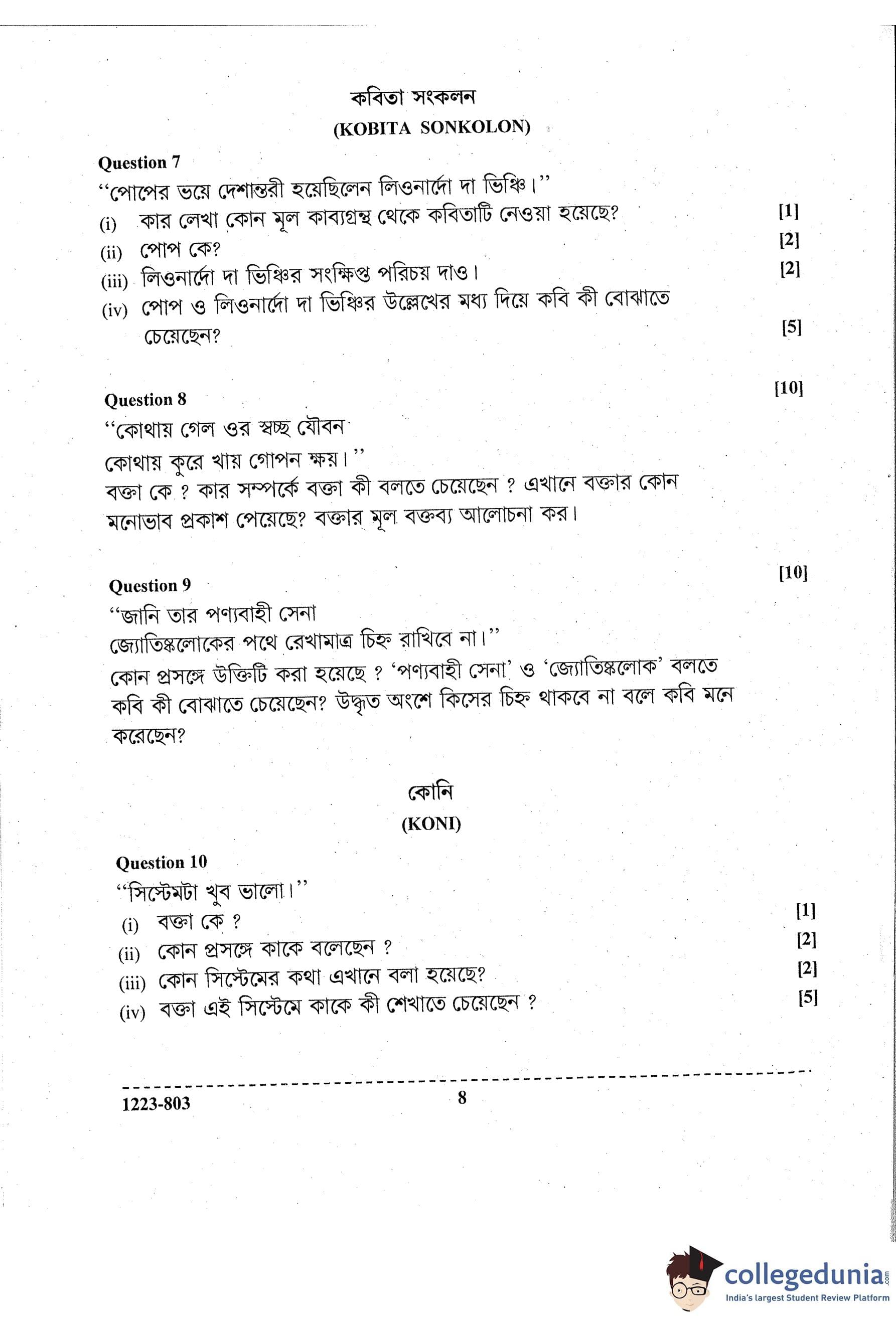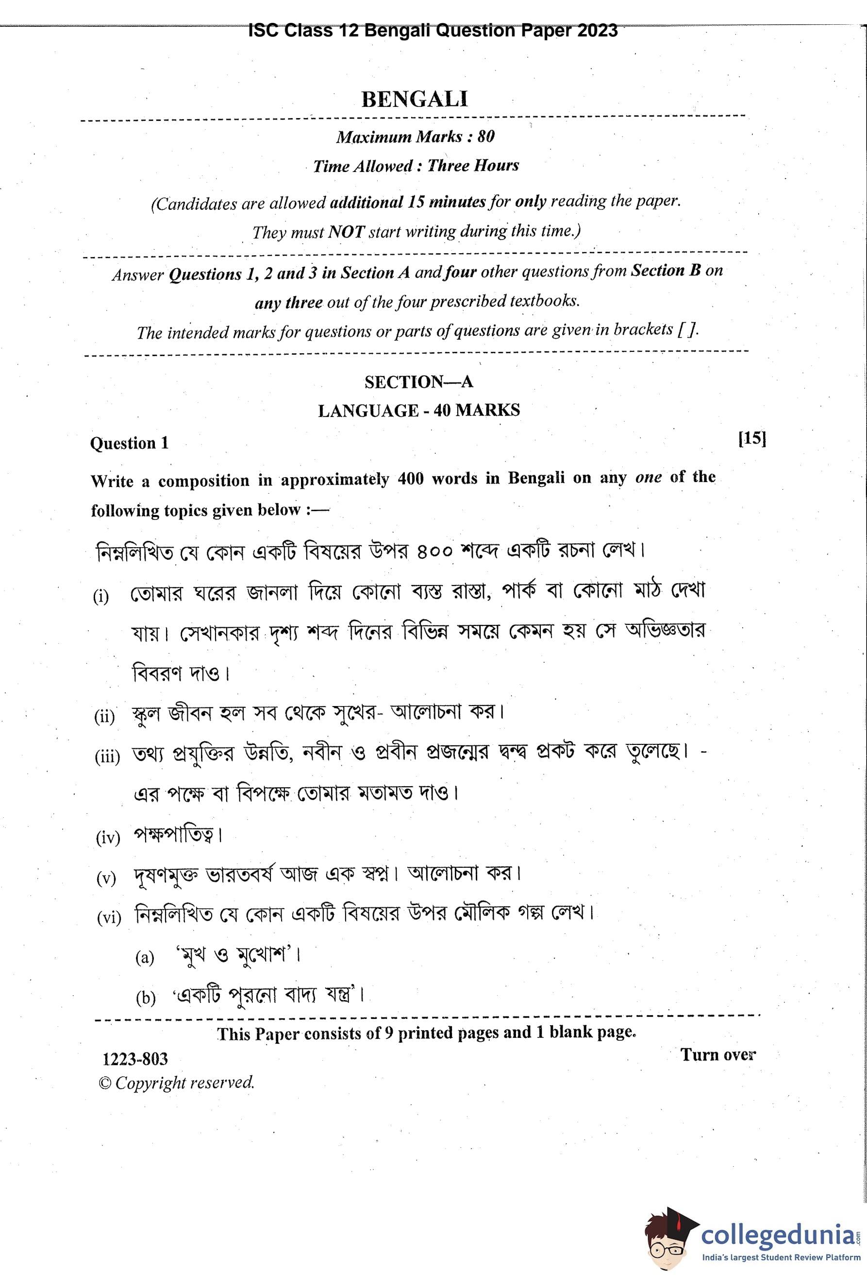 ISC Class 12 Bengali Question Paper 2023 with Answer Key