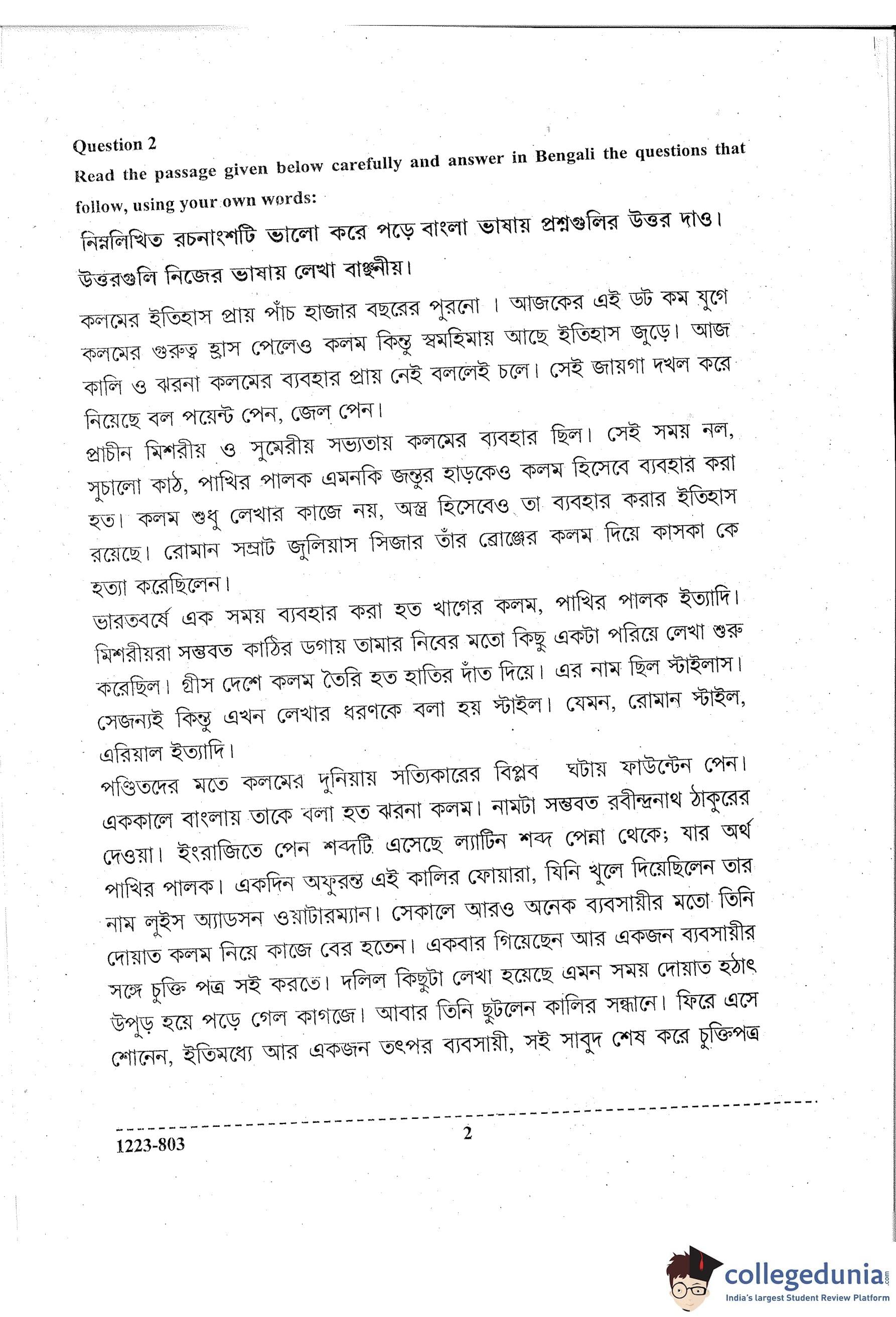 ISC Class 12 Bengali Question Paper 2023 with Answer Key pdf is available for download here. The exam was conducted by Council for the Indian School Certificate Examinations (CISCE) on March 3, 2023 in the Afternoon Session 2 PM to 5 PM. The question paper comprised a total of 15 questions divided among 2 sections.