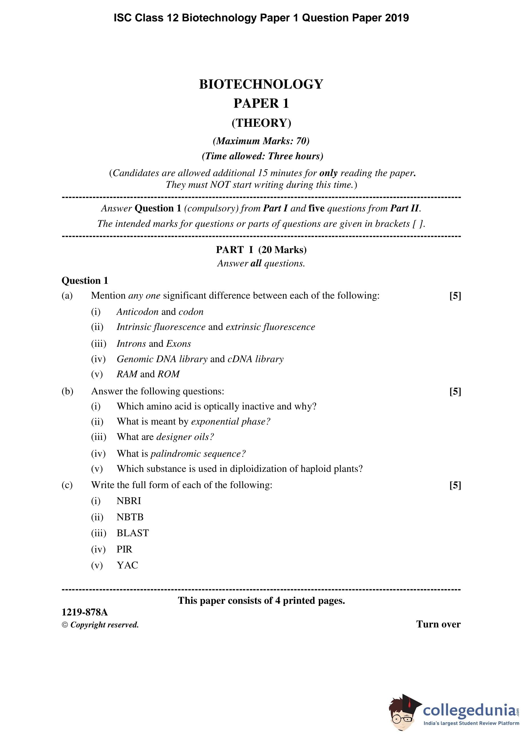 ISC Class 12 Biotechnology Paper 1 Question Paper 2019 with Answer Key