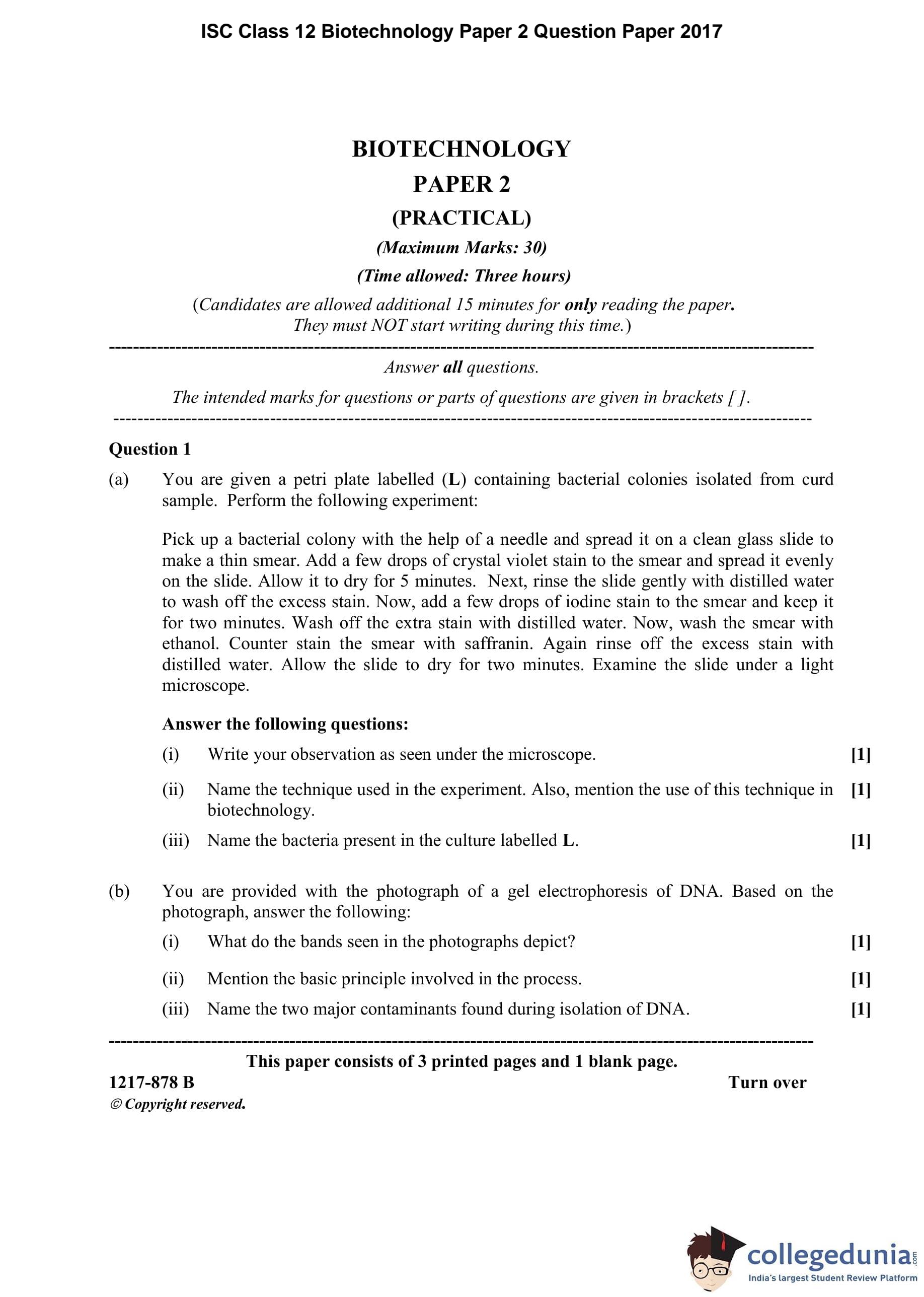 ISC Class 12 Biotechnology Paper 2 Question Paper 2017 with Answer Key