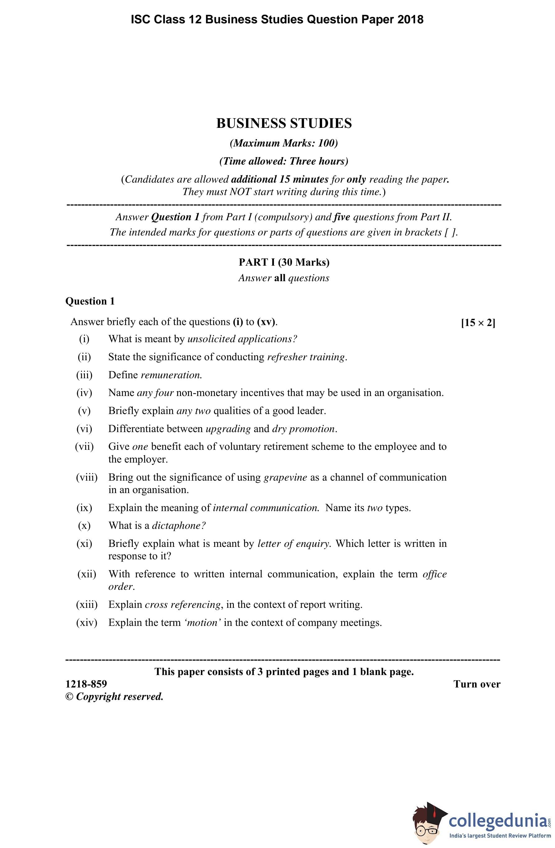 ISC Class 12 Business Studies Question Paper 2018 with Answer Key