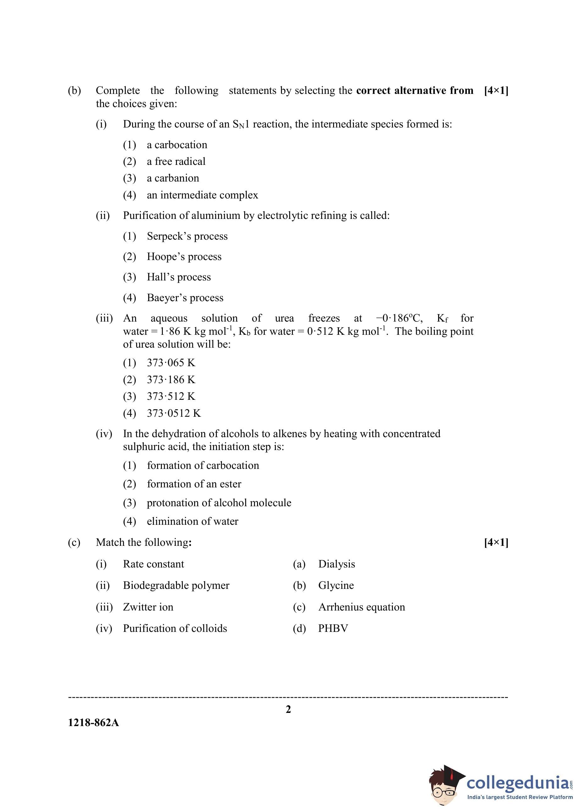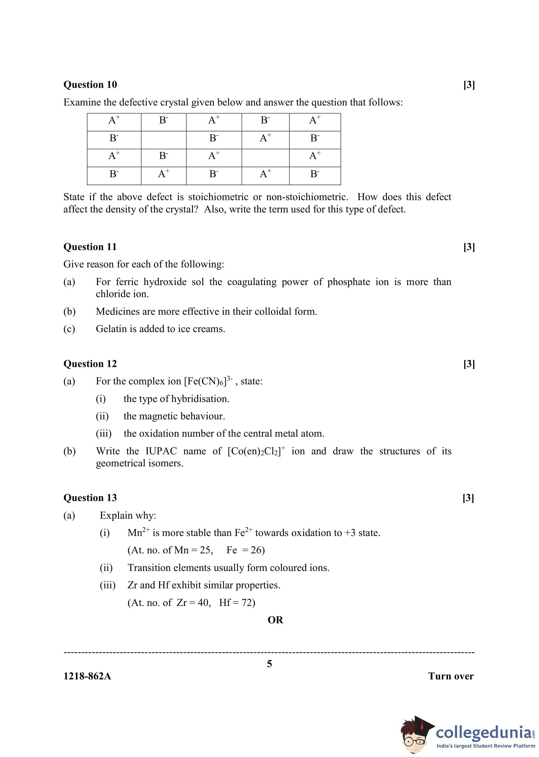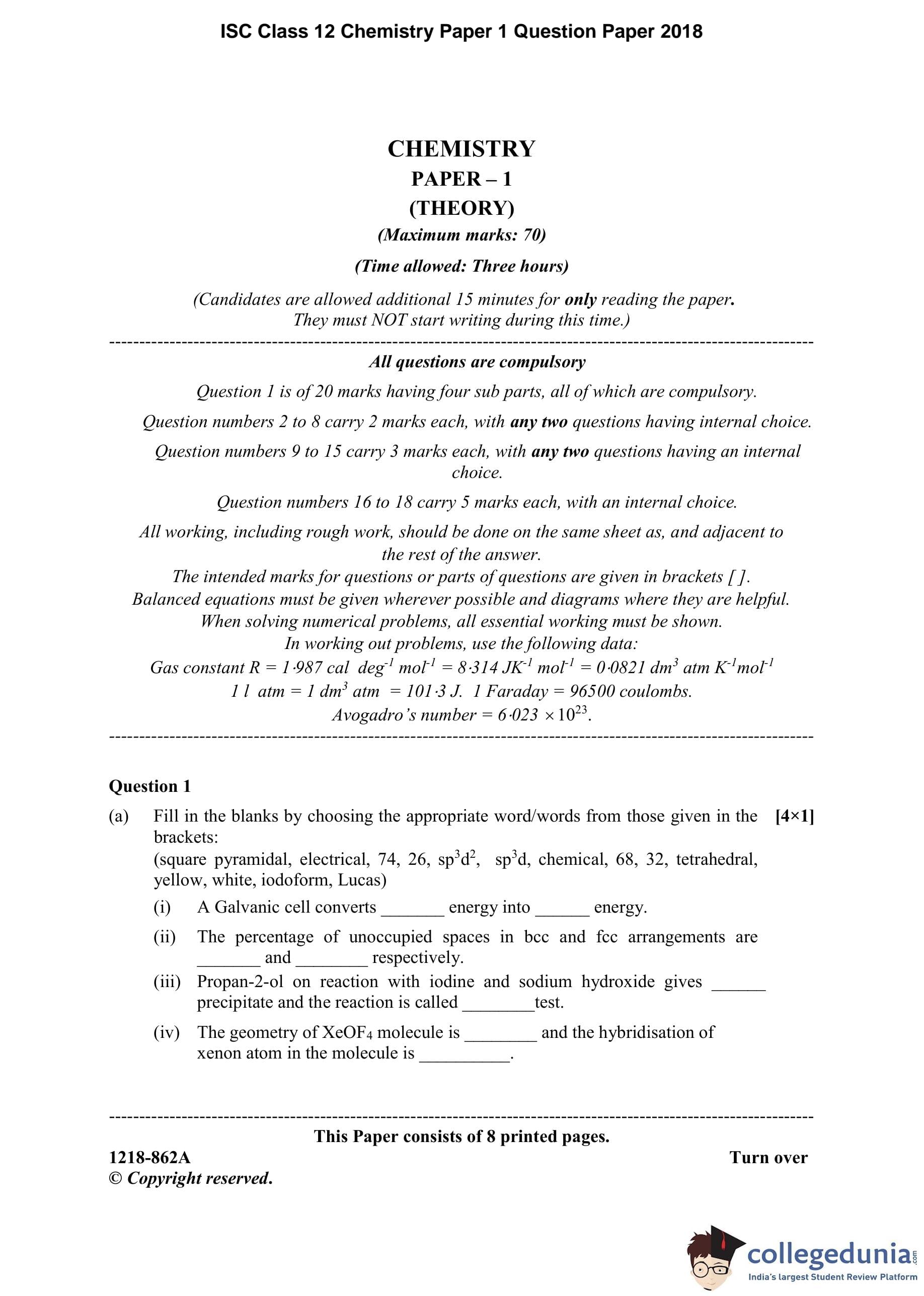ISC Class 12 Chemistry Paper 1 Question Paper 2018 with Answer Key