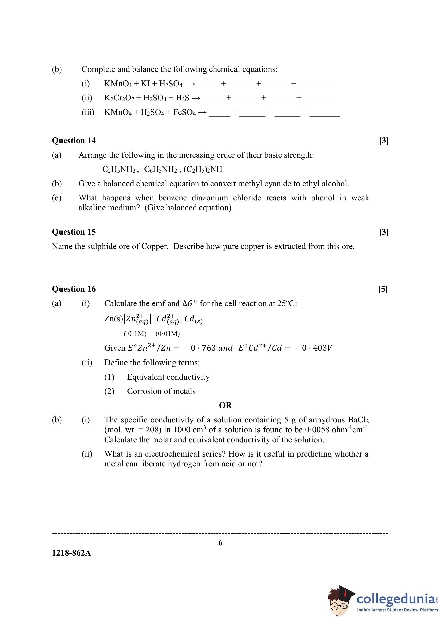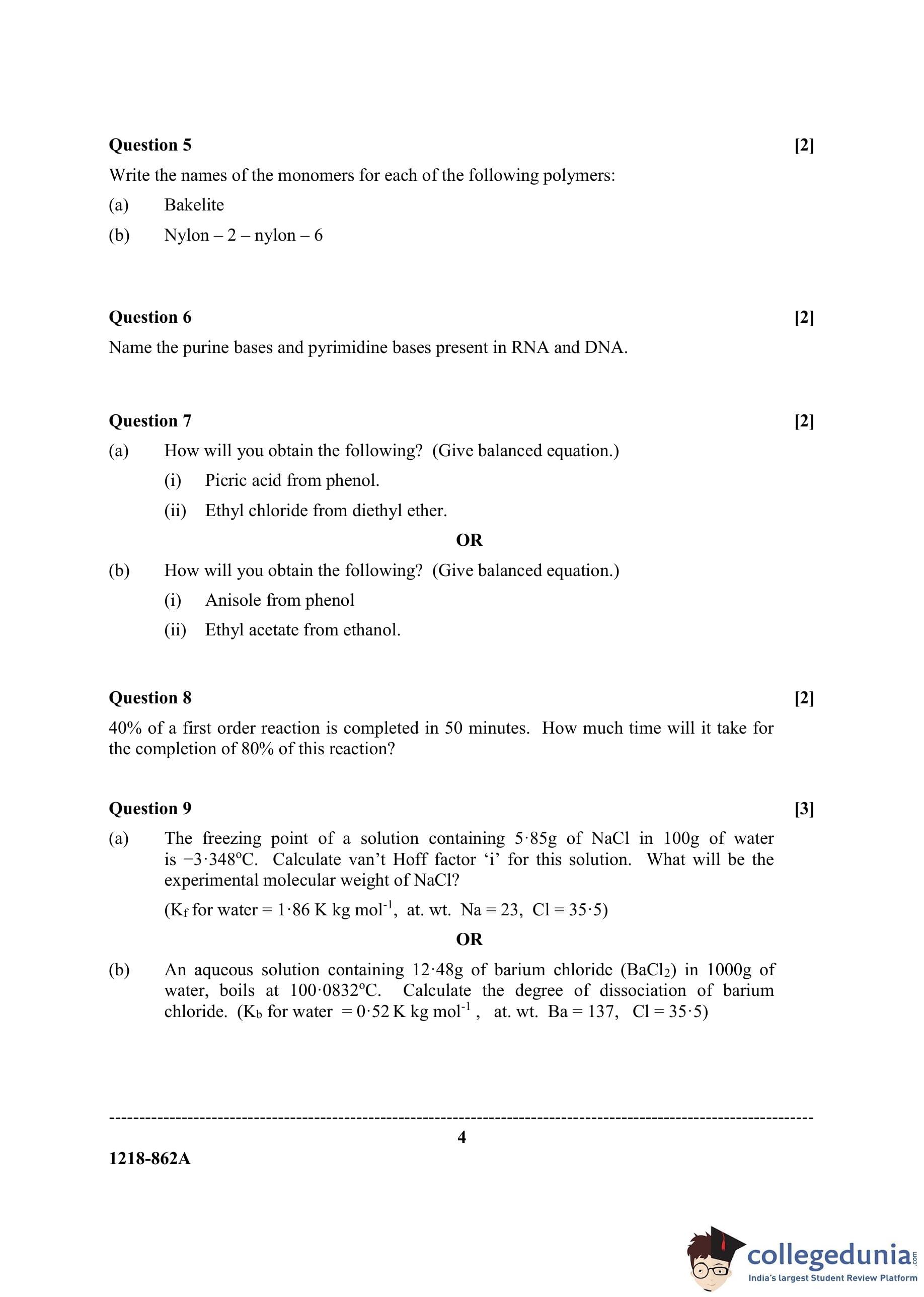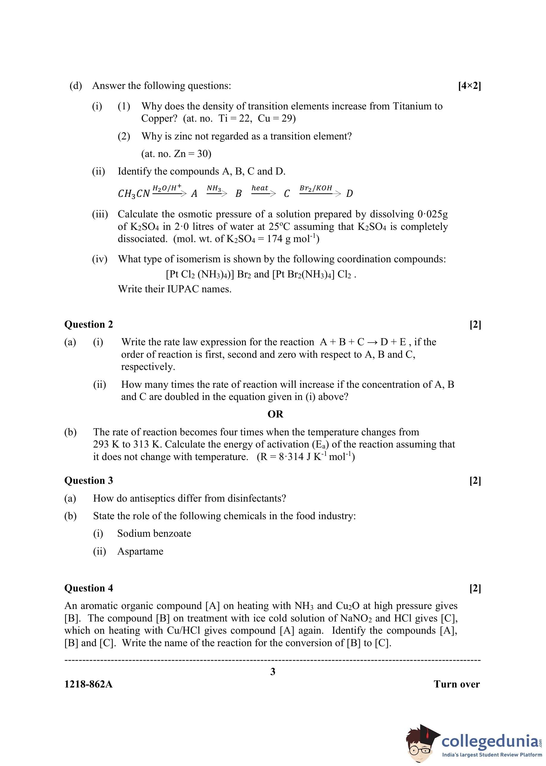 ISC Class 12 Chemistry Paper 1 Question Paper 2018 with Answer Key