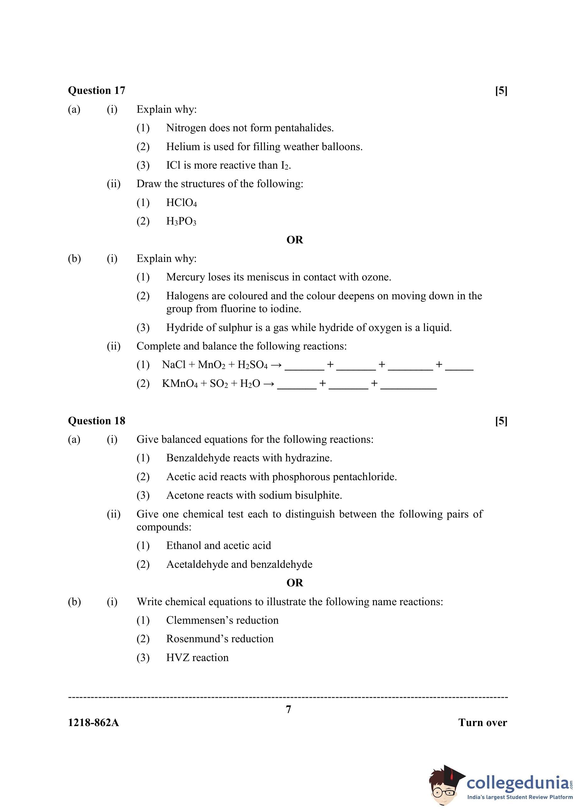 ISC Class 12 Chemistry Paper 1 Question Paper 2018 with Answer Key pdf is available for download here. The exam was conducted by Council for the Indian School Certificate Examinations on March 5, 2018 in the Afternoon Session 2 PM to 5 PM. The question paper comprised a total of 18 questions.