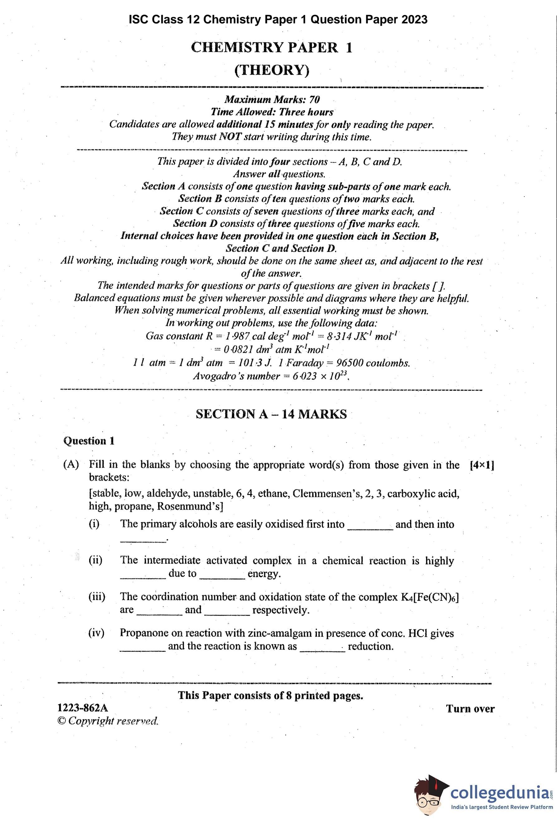 ISC Class 12 Chemistry Paper 1 Question Paper 2023 with Answer Key pdf is available for download here. The exam was conducted by Council for the Indian School Certificate Examinations (CISCE) on February 27, 2023 in the Afternoon Session 2 PM to 5 PM. In terms of difficulty, ISC Class 12 Chemistry Paper 1 was considered as Moderate level. The question paper comprised a total of 21 questions divided among 3 sections.