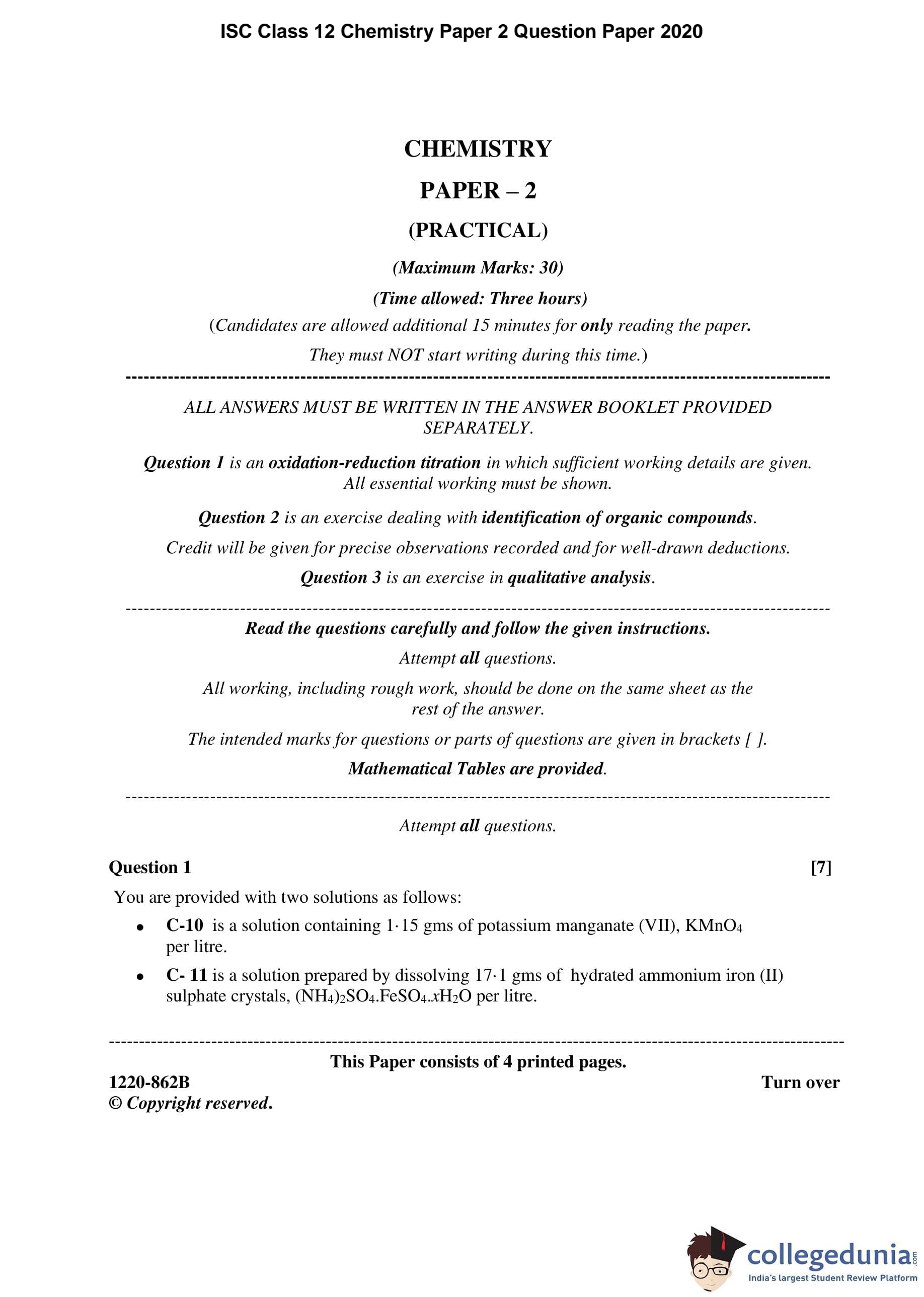 | ISC Class 12 Chemistry Paper 2 Question Paper 2020 PDF | ISC Class 12 Chemistry Paper 2 Answer Key 2020 PDF |