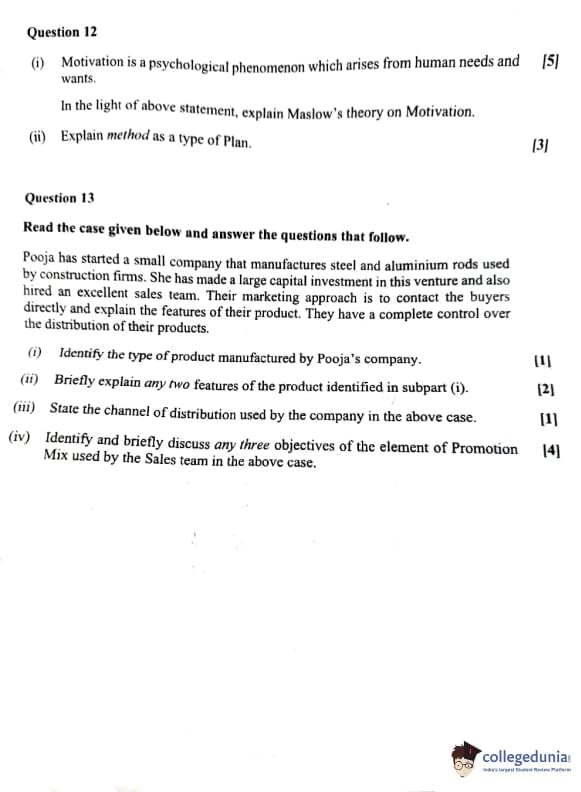 (i) The type of product manufactured by Pooja's company is industrial goods (or business goods/ B2B goods). Industrial goods are products used in the production of other goods or for providing services, rather than being sold directly to consumers. Steel and aluminum rods used by construction firms fall into this category. Consumer goods, on the other hand, are purchased by the consumer for direct consumption.