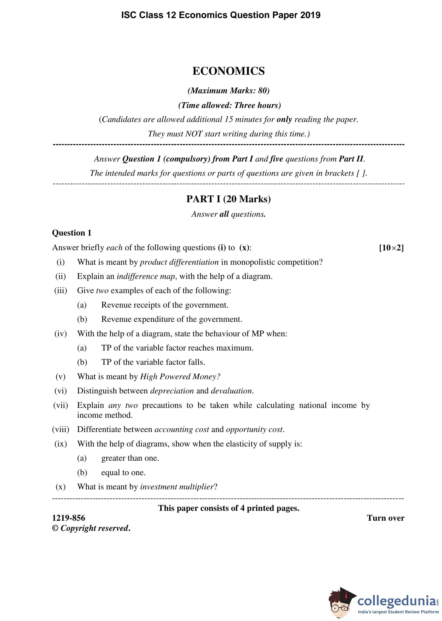 ISC Class 12 Economics Question Paper 2019 with Answer Key