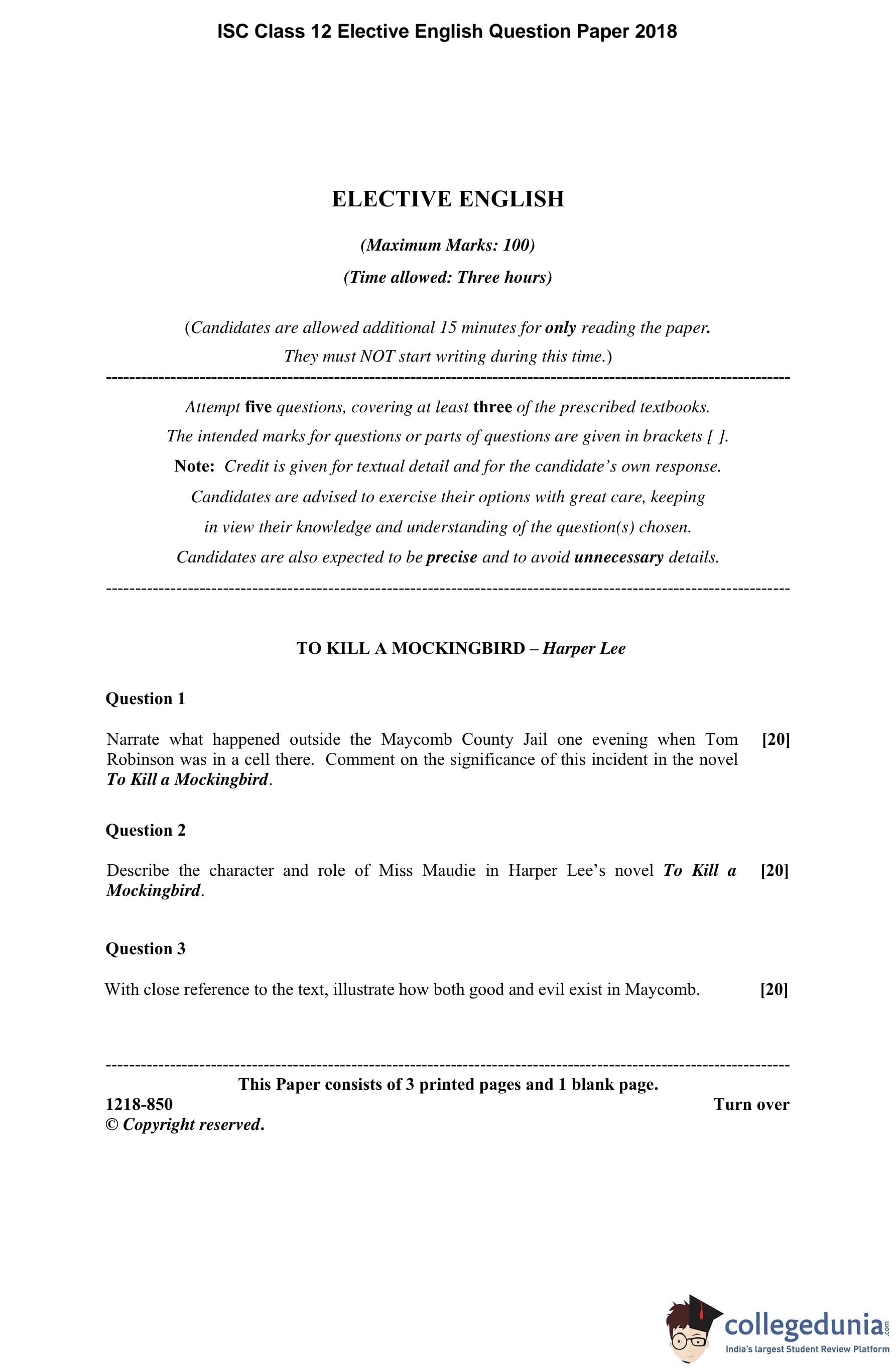 ISC Class 12 Elective English Question Paper 2018 with Answer Key