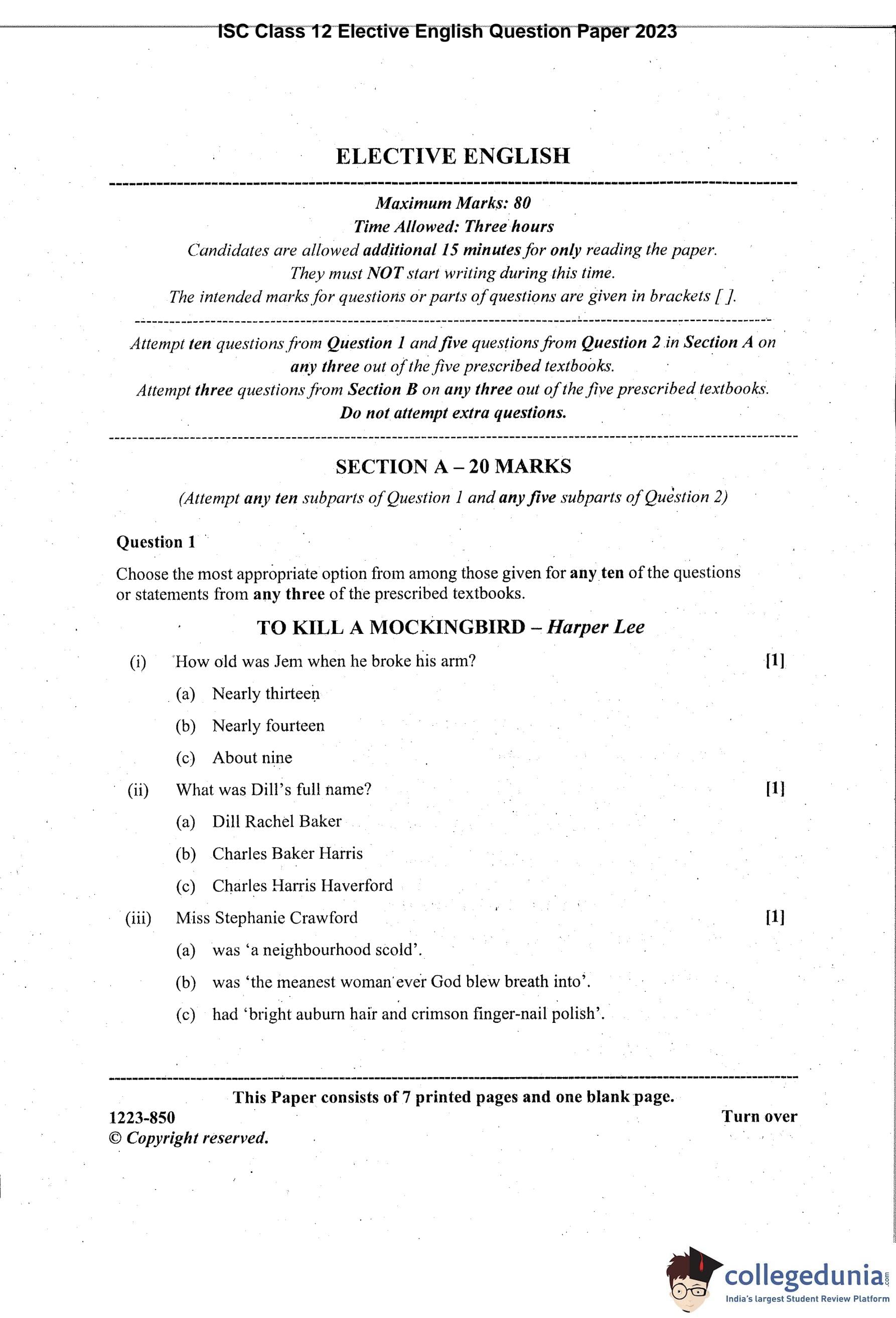 ISC Class 12 Elective English Question Paper 2023 with Answer Key pdf is available for download here. The exam was conducted by Council for the Indian School Certificate Examinations (CISCE) on March 25, 2023 in the Afternoon Session 2 PM to 5 PM. The question paper comprised a total of 7 questions divided among 2 sections.