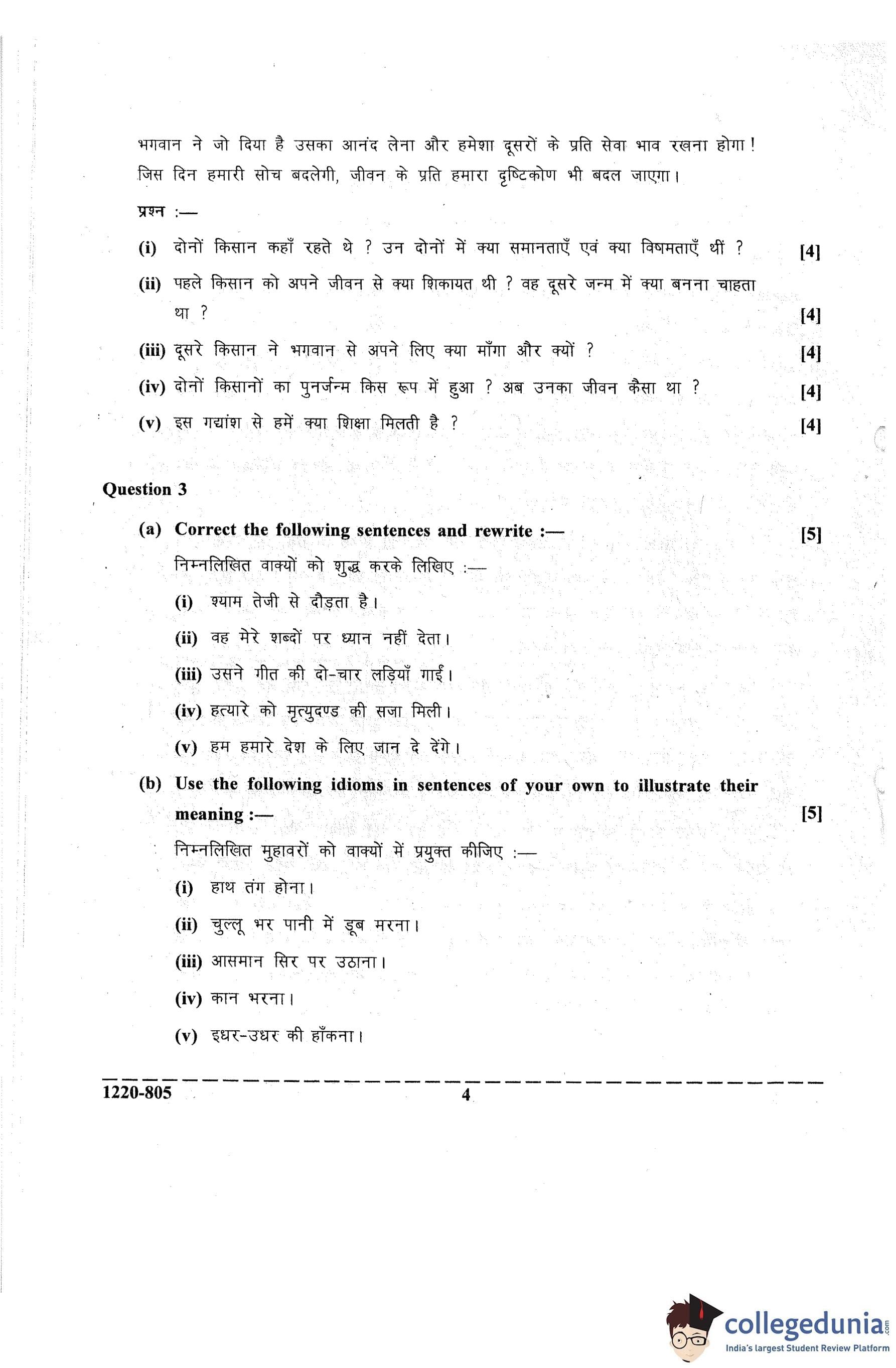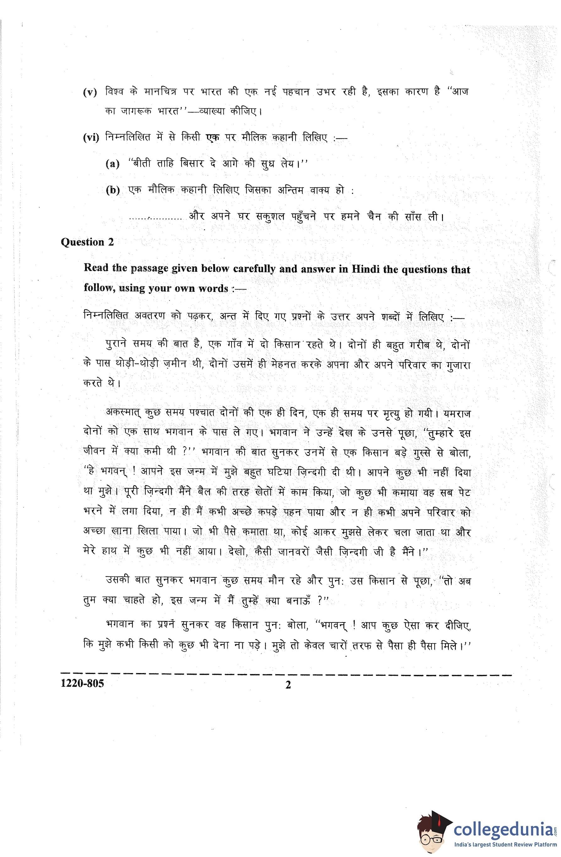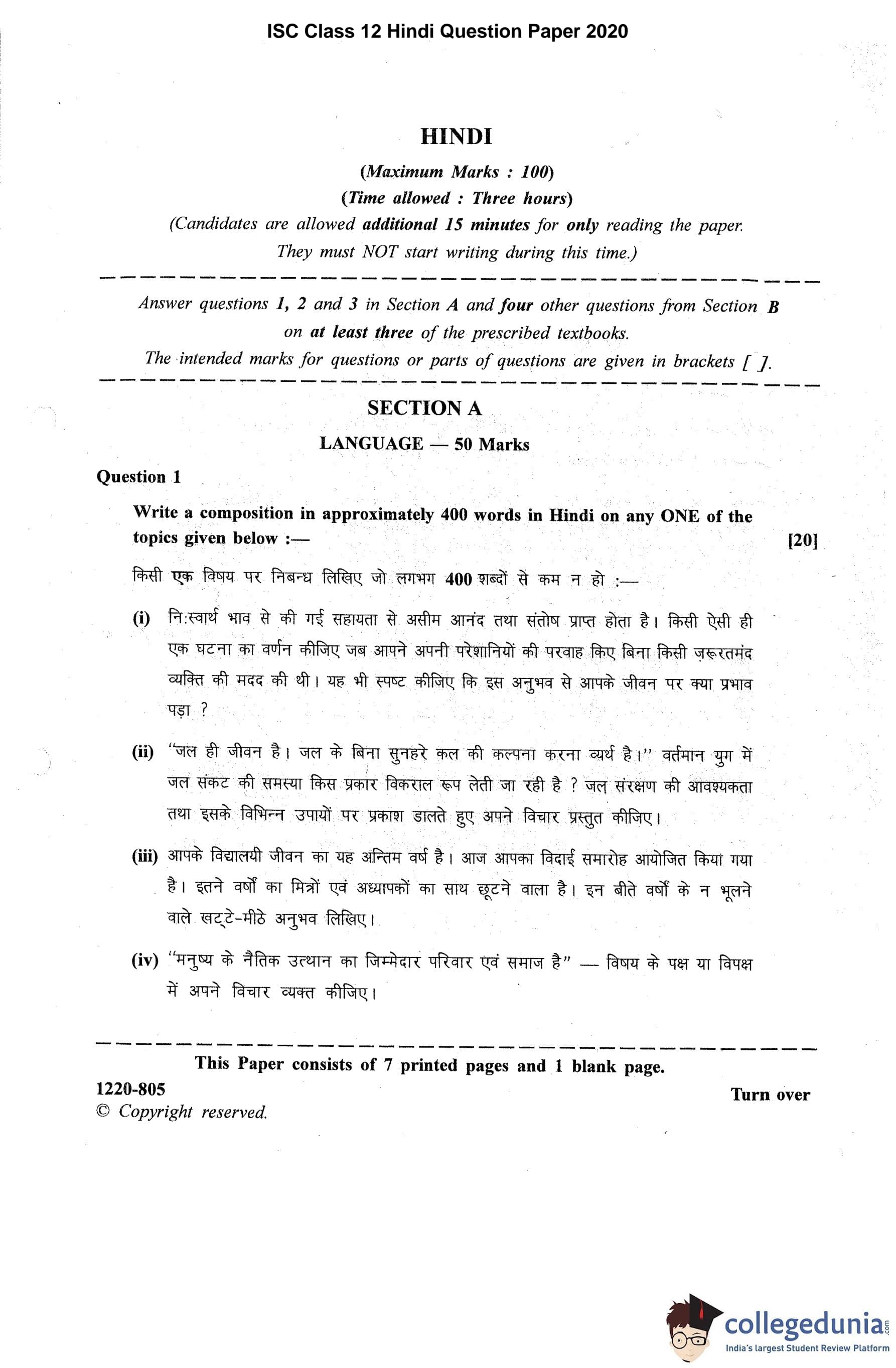 ISC Class 12 Hindi Question Paper 2020 with Answer Key