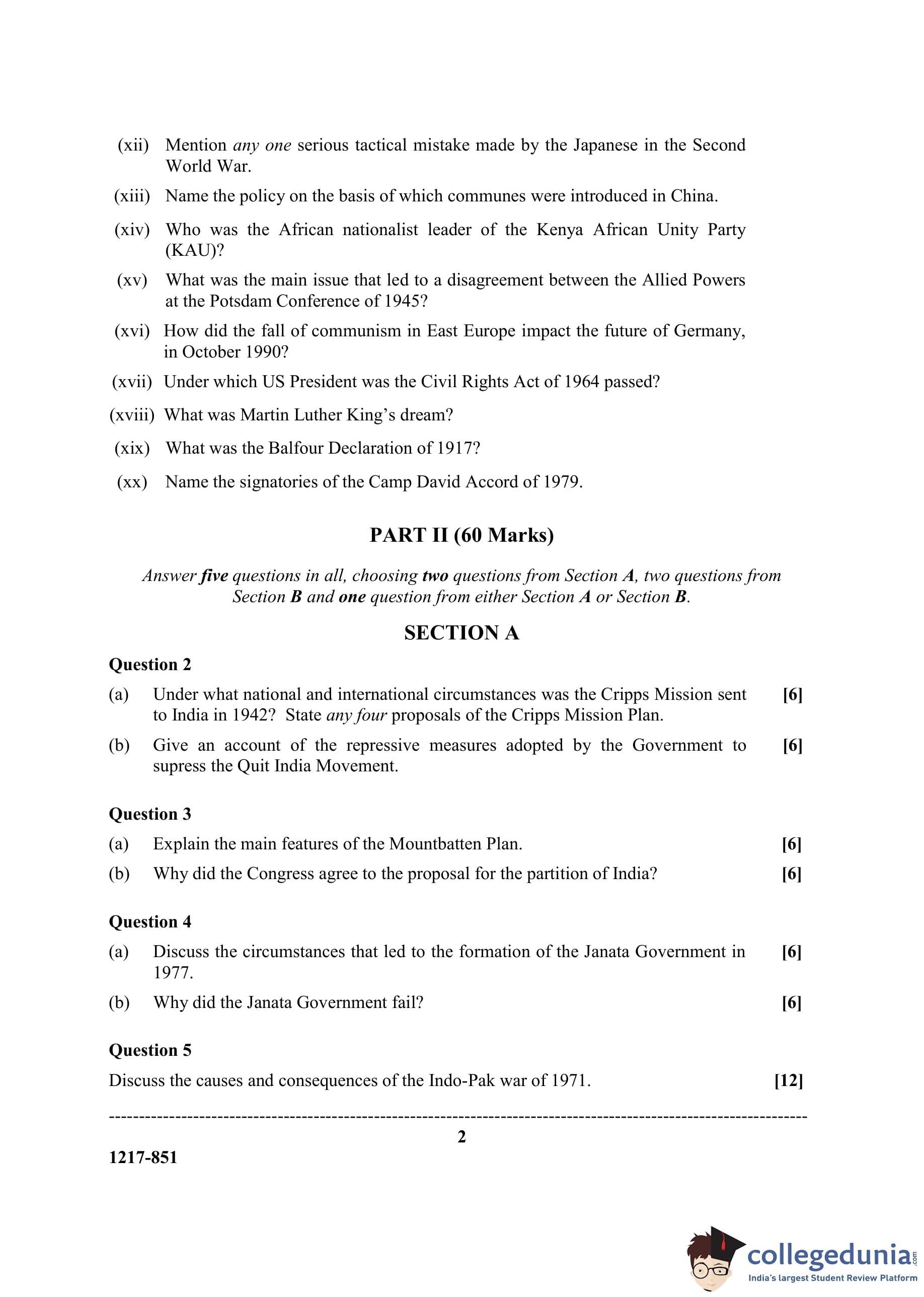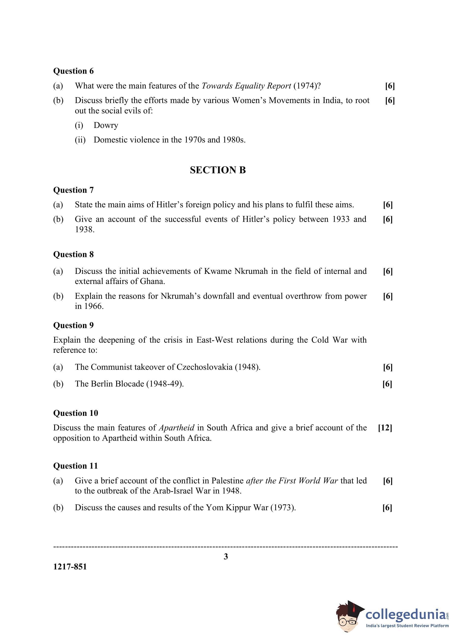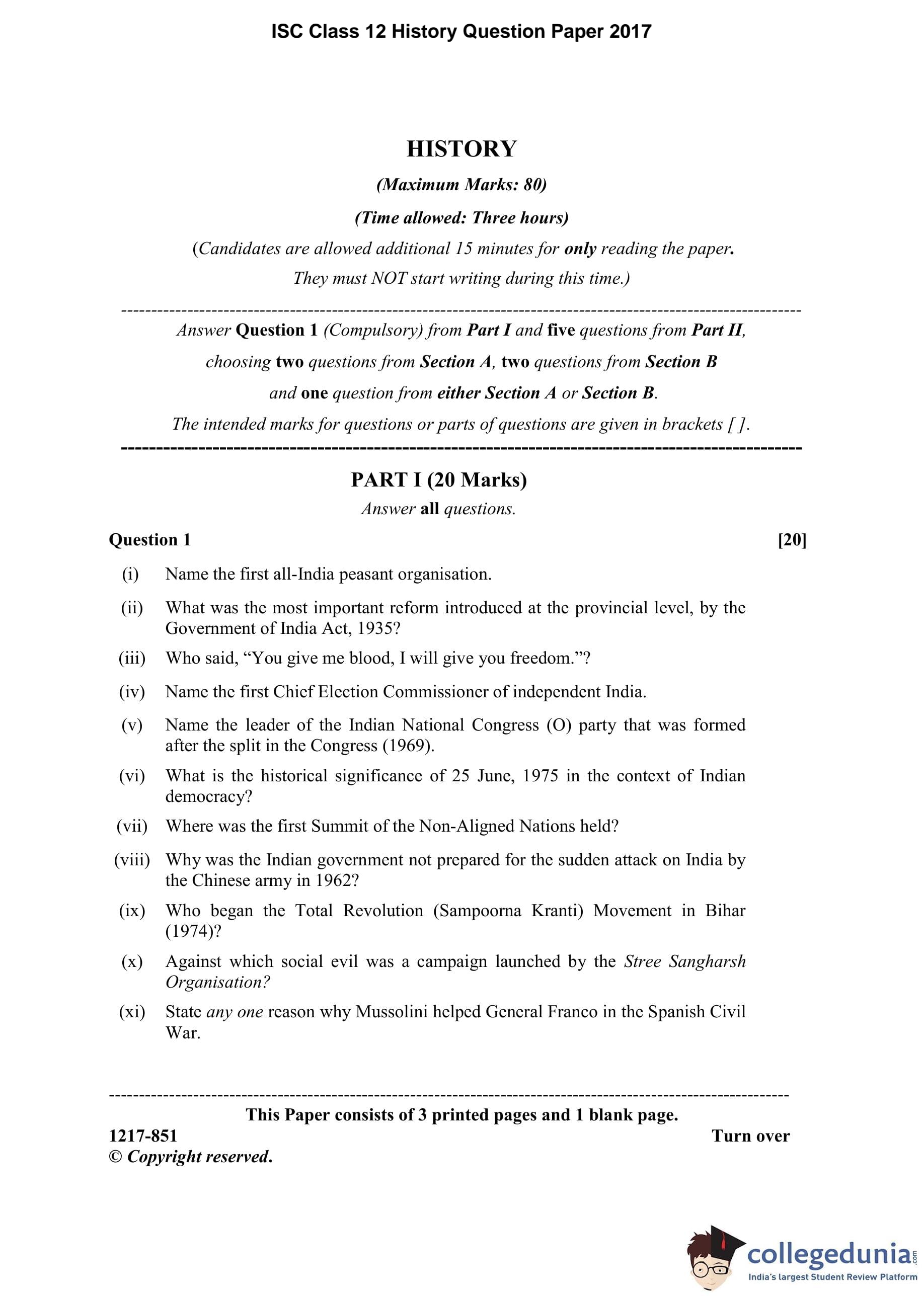ISC Class 12 History Question Paper 2017 with Answer Key