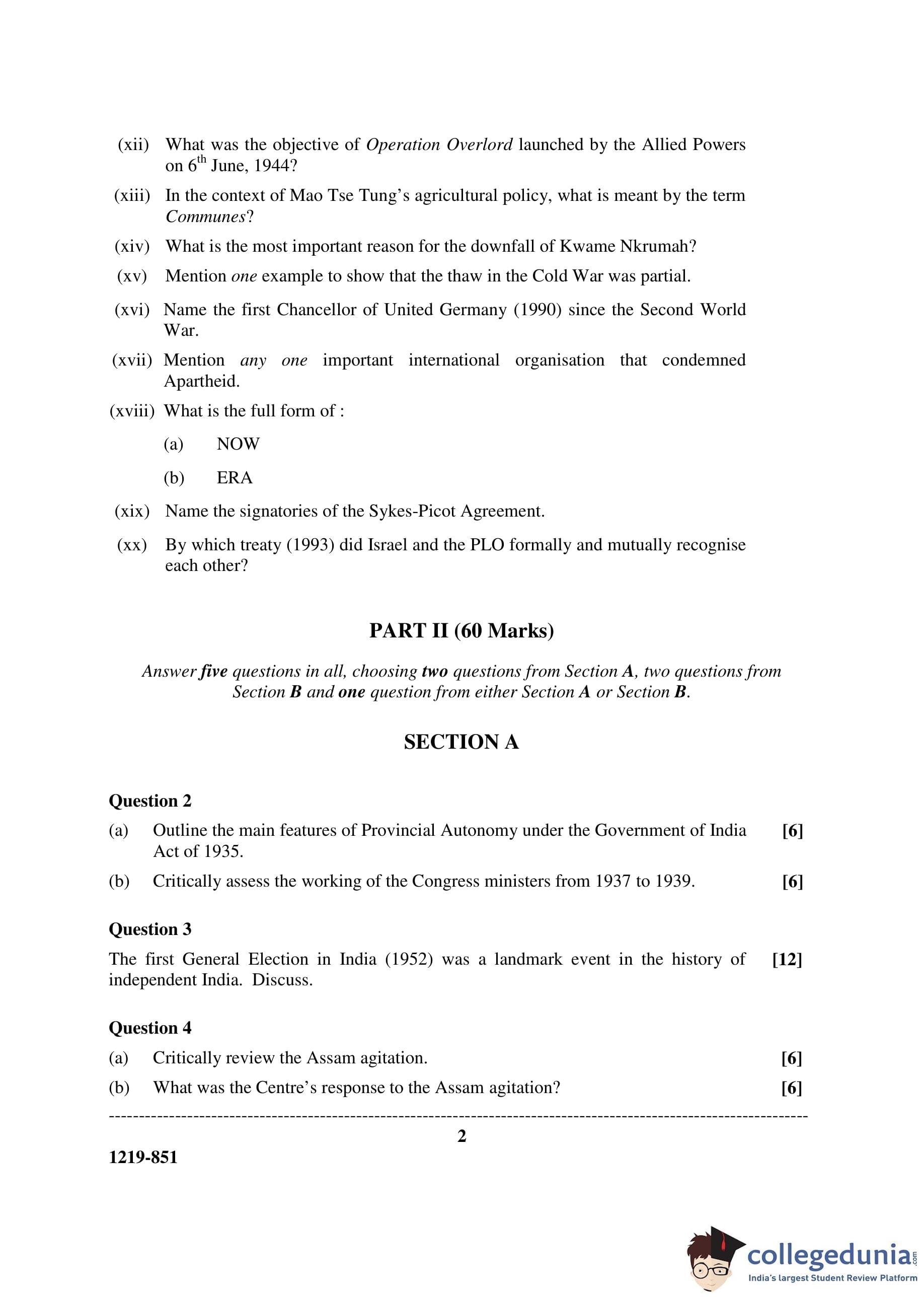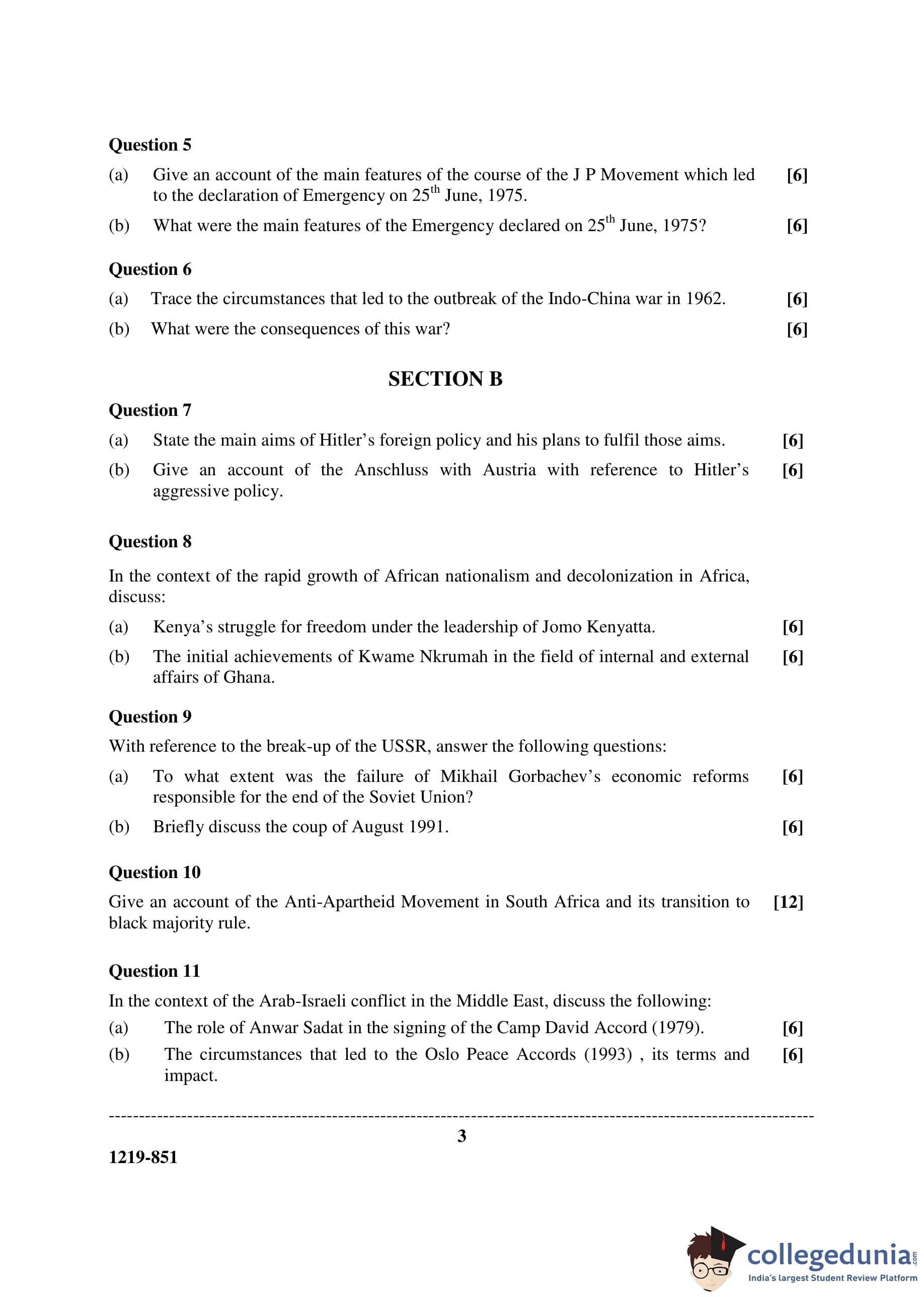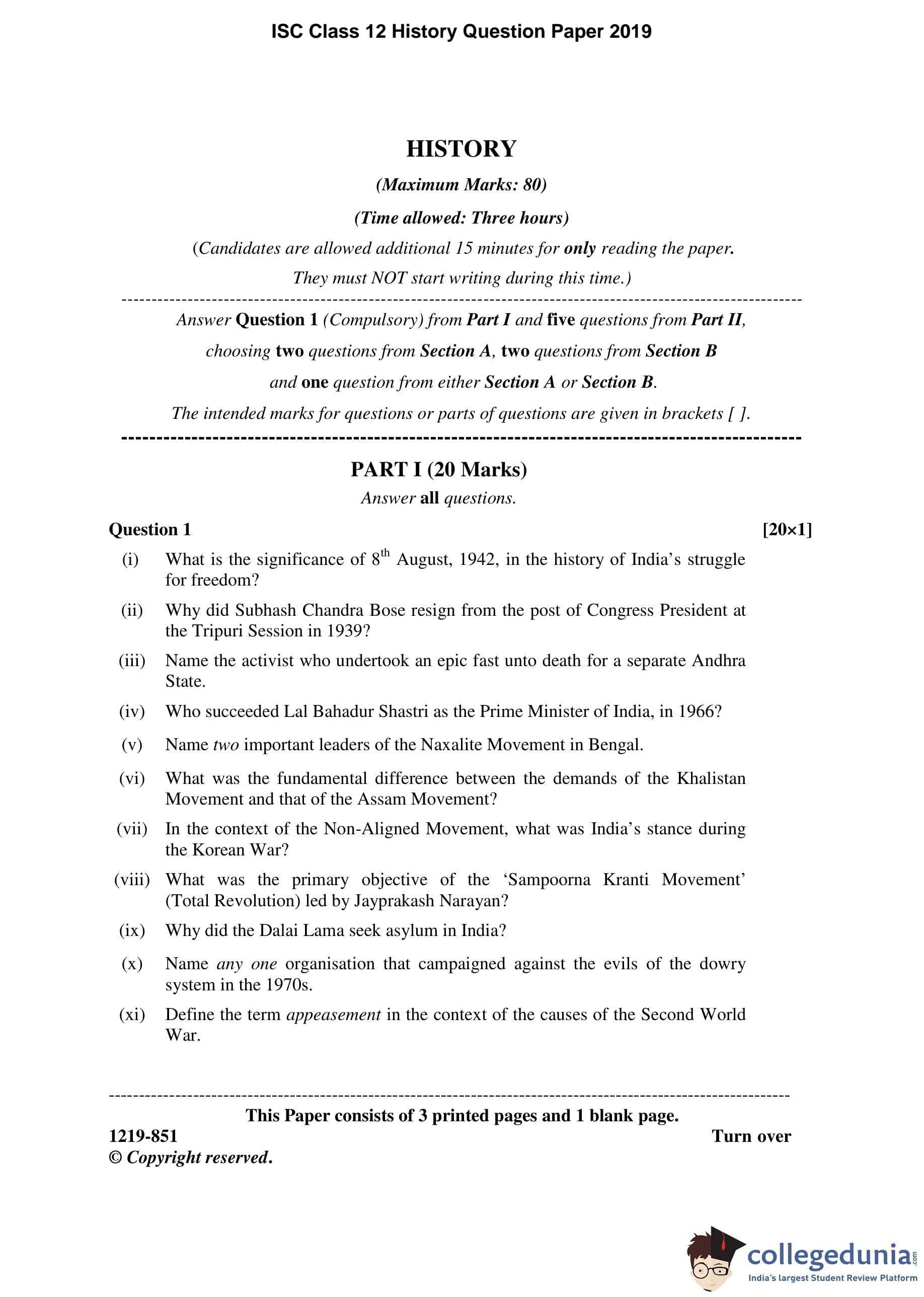 ISC Class 12 History Question Paper 2019 with Answer Key
