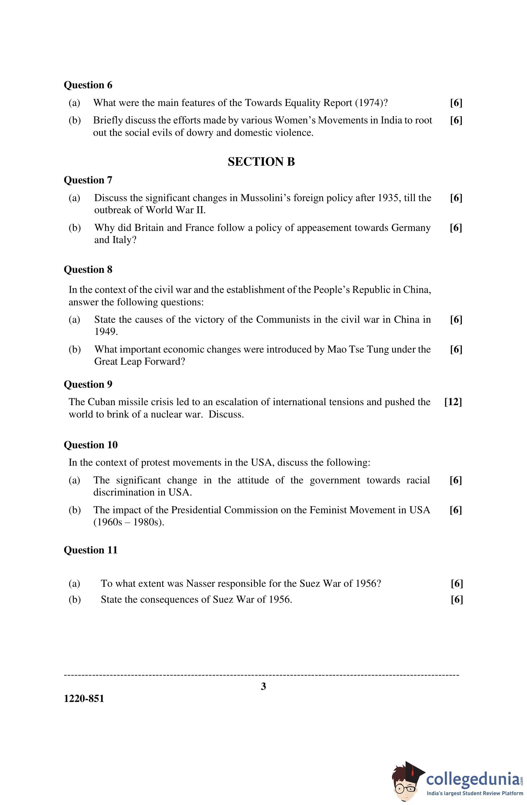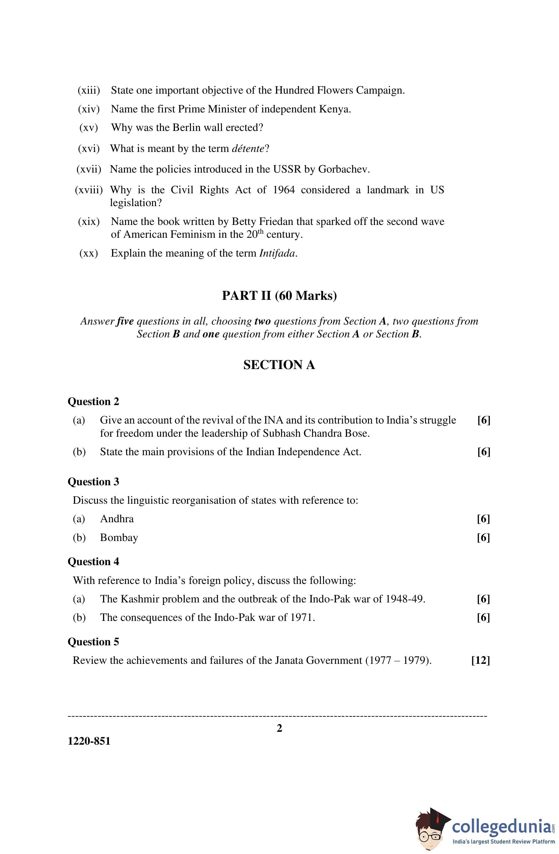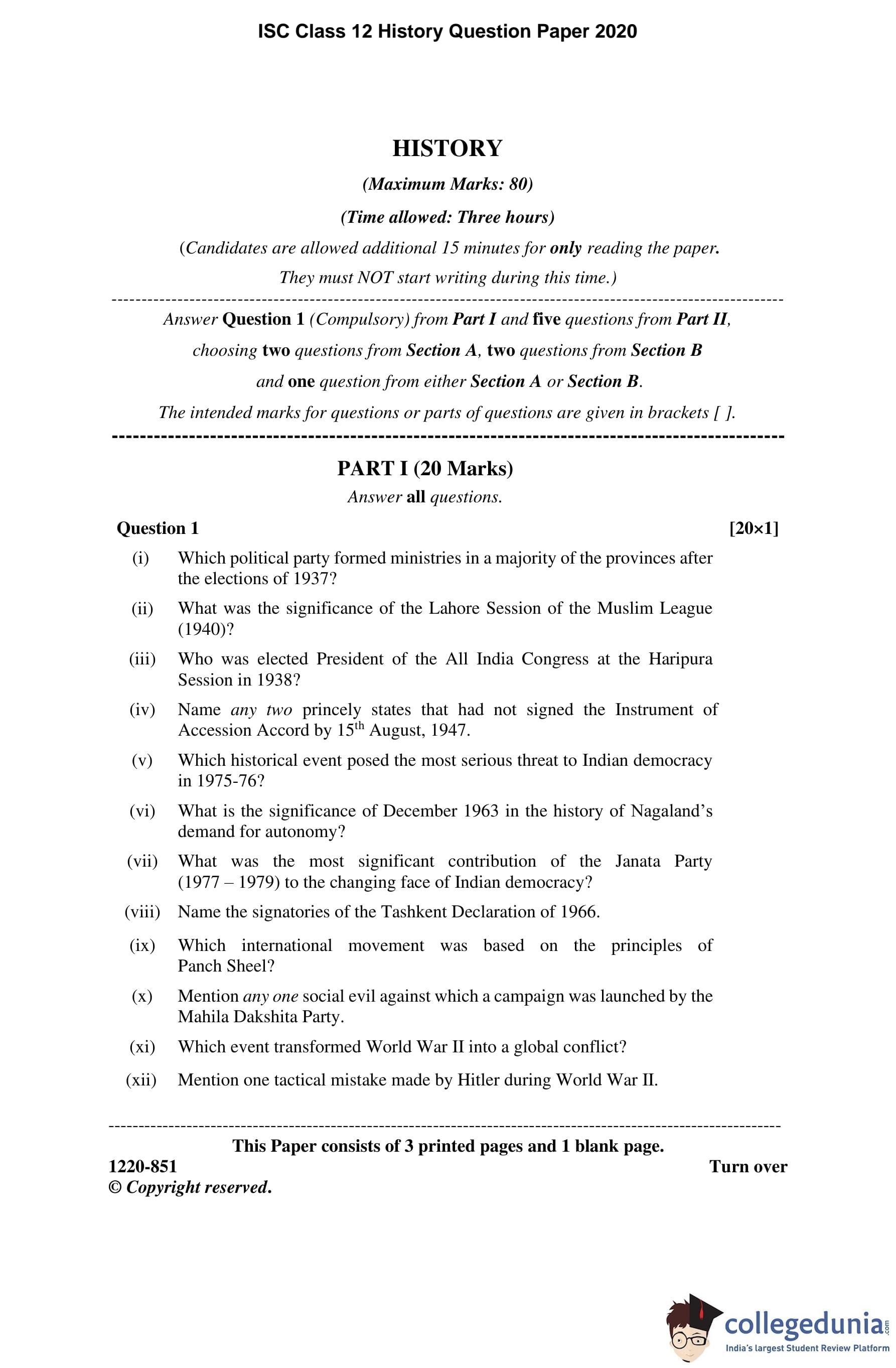 ISC Class 12 History Question Paper 2020 with Answer Key