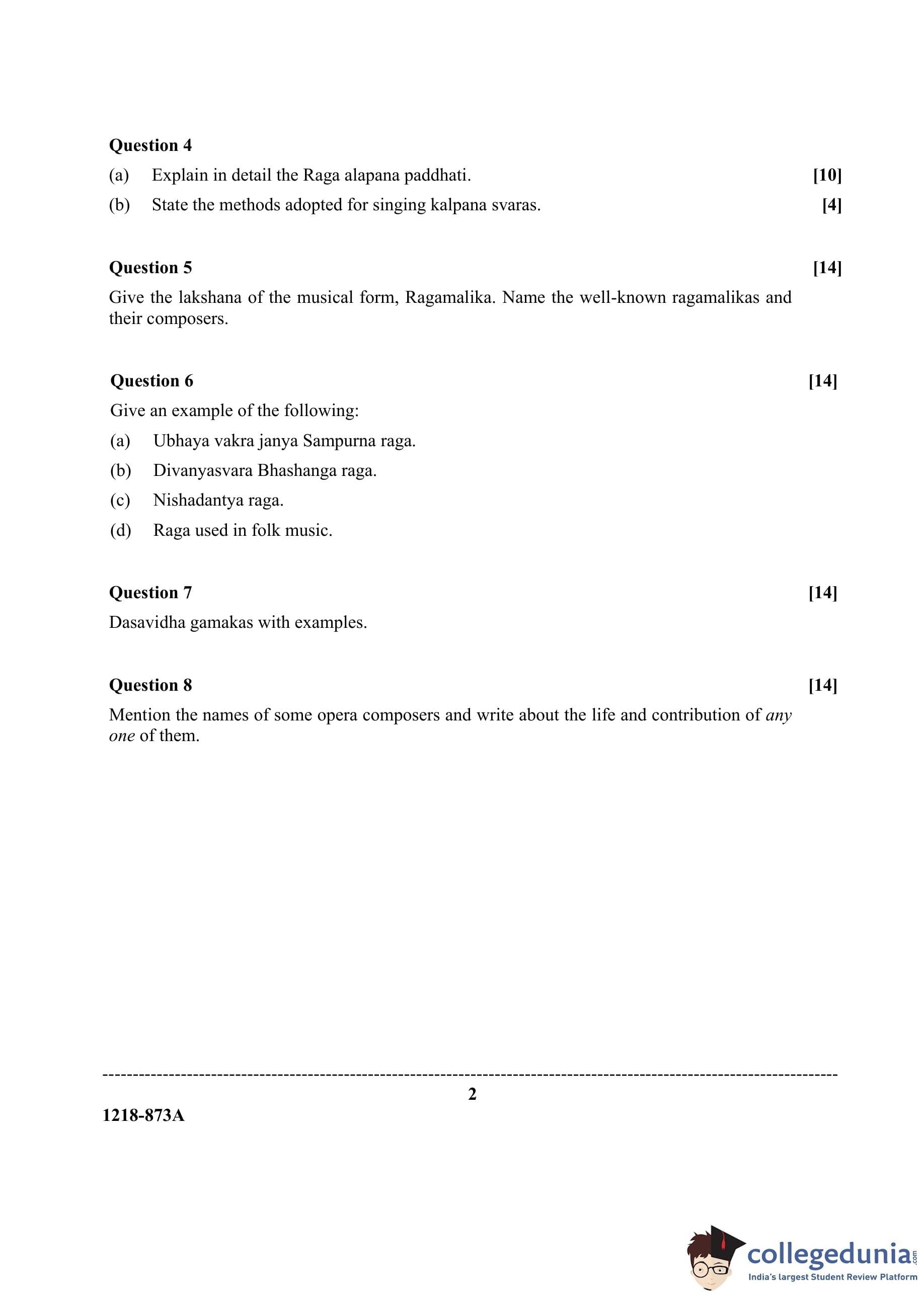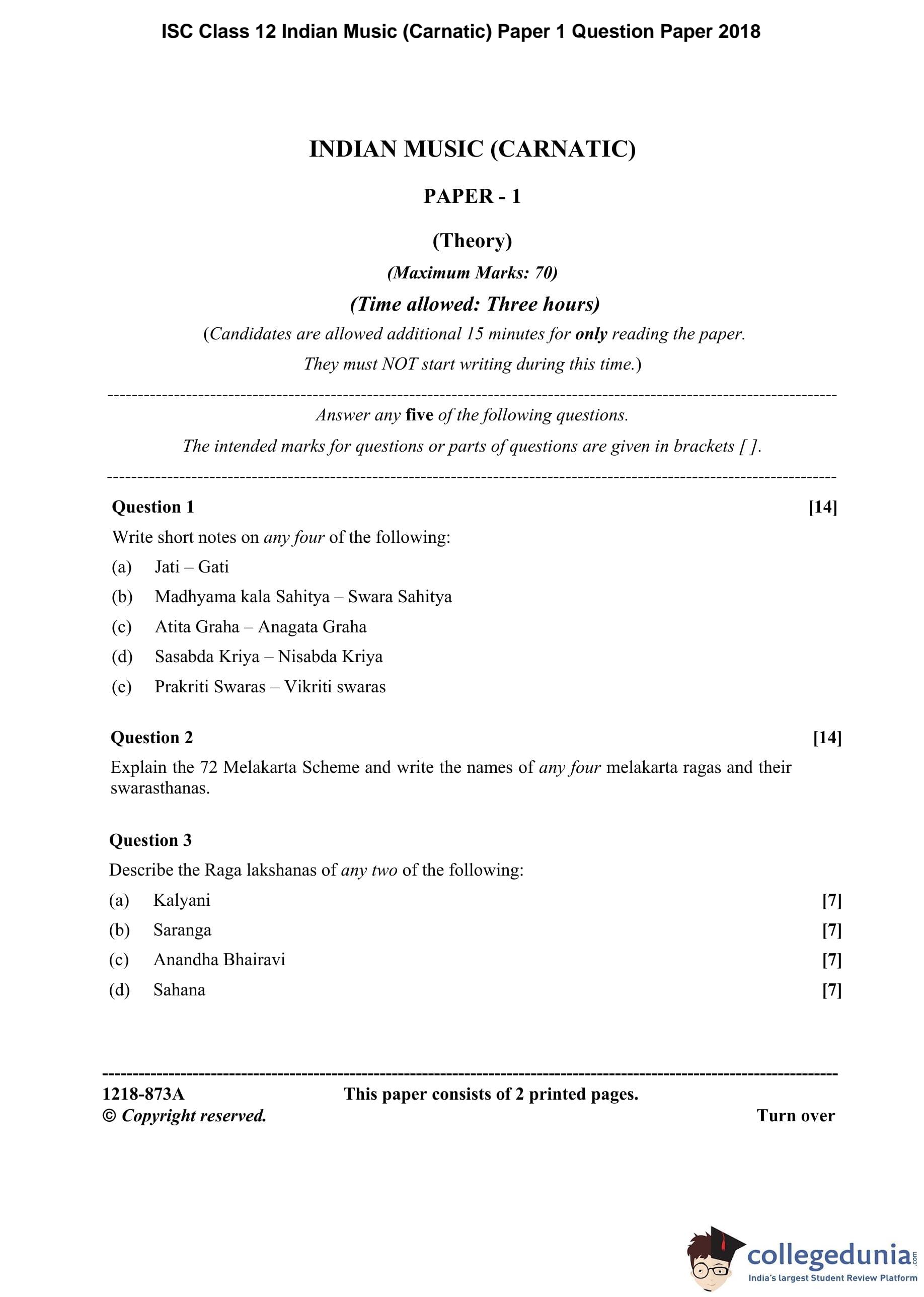 ISC Class 12 Indian Music (Carnatic) Paper 1 Question Paper 2018 with Answer Key