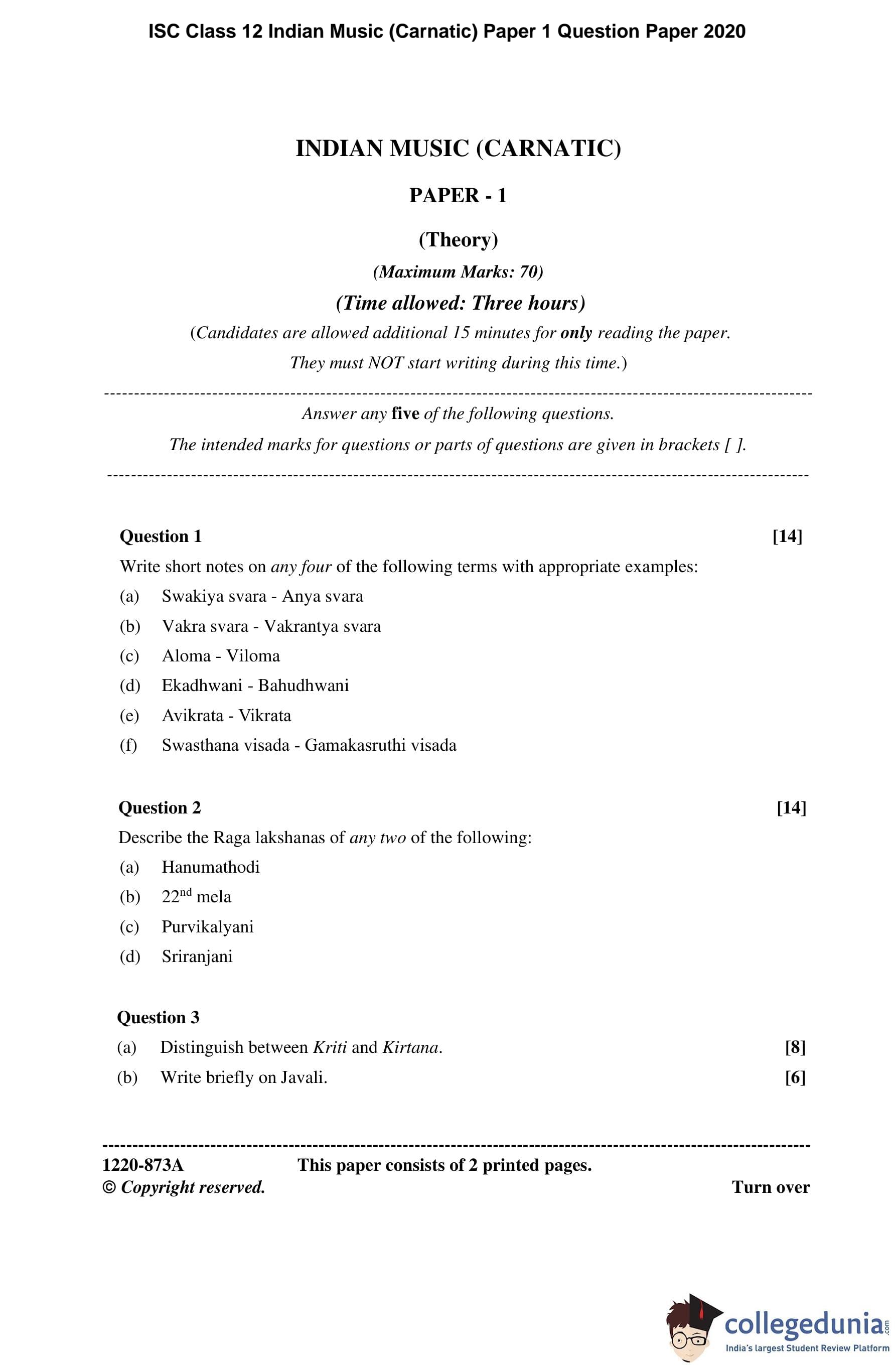 ISC Class 12 Indian Music (Carnatic) Paper 1 Question Paper 2020 with Answer Key