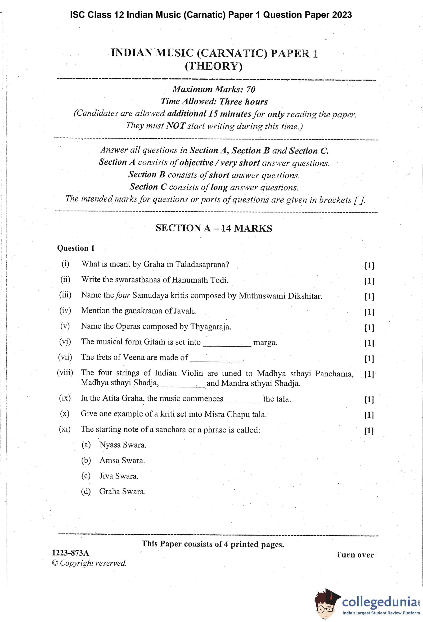 ISC Class 12 Indian Music (Carnatic) Paper 1 Question Paper 2023 with Answer Key