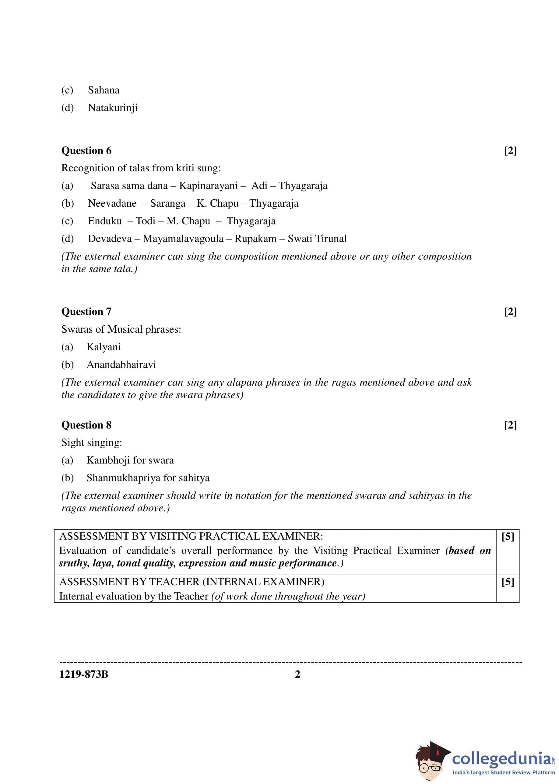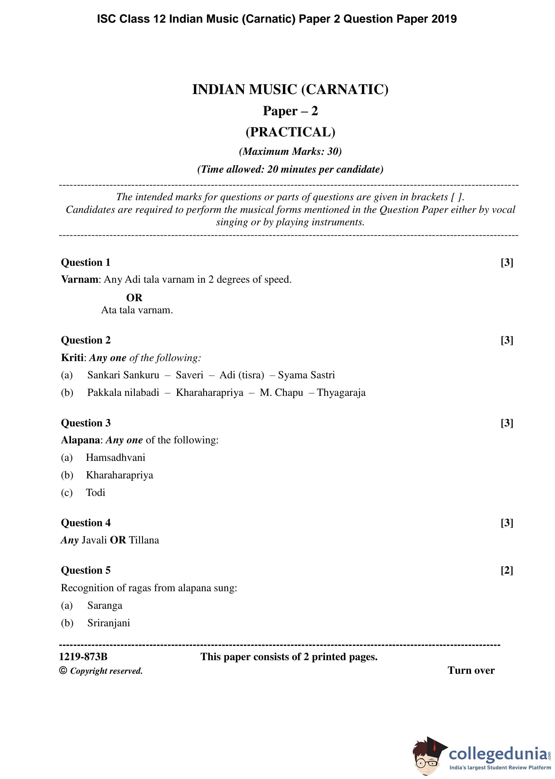 ISC Class 12 Indian Music (Carnatic) Paper 2 Question Paper 2019 with Answer Key