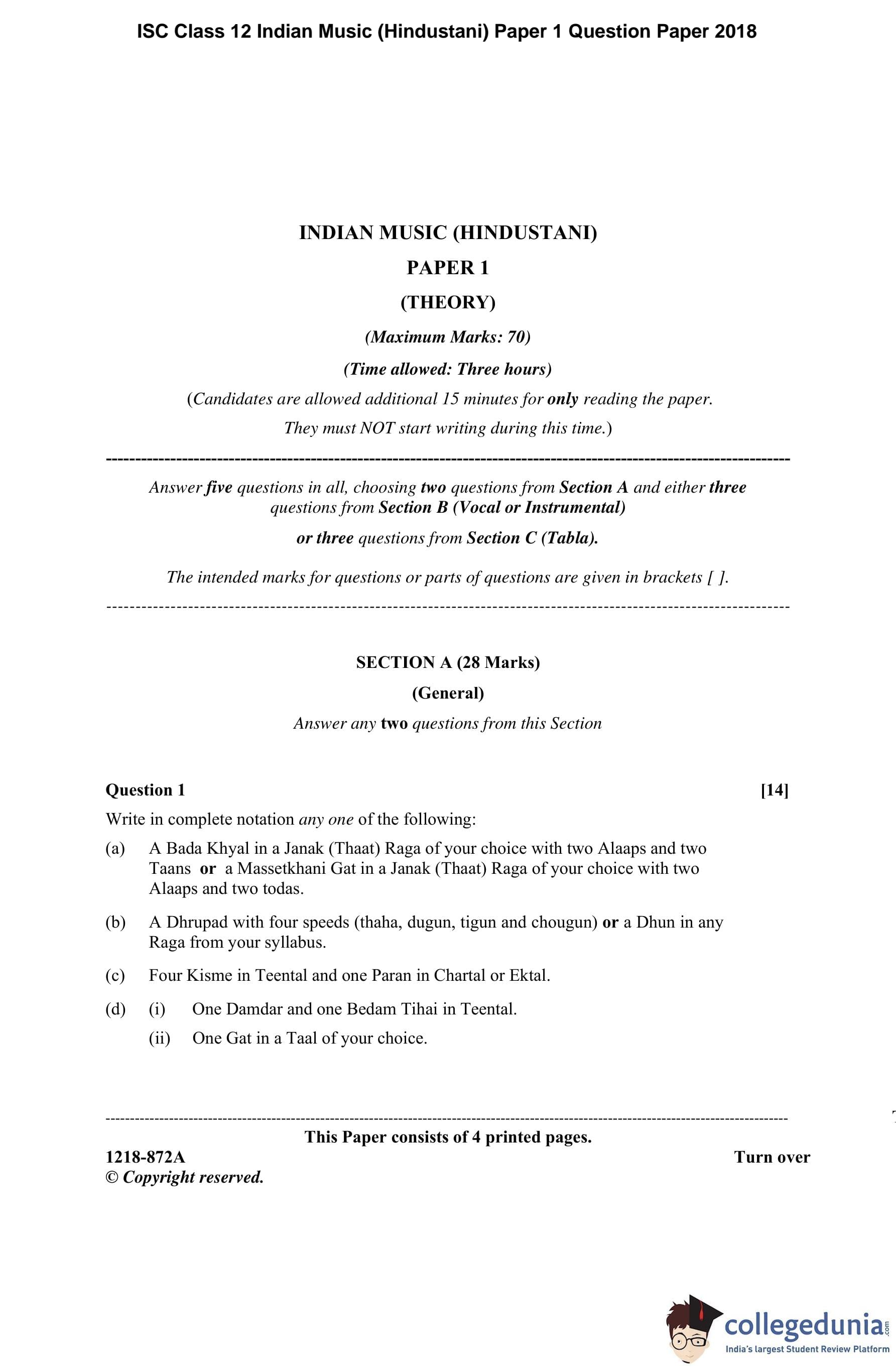 | ISC Class 12 Indian Music (Hindustani) Paper 1 Question Paper 2018 PDF | ISC Class 12 Indian Music (Hindustani) Paper 1 Answer Key 2018 PDF |