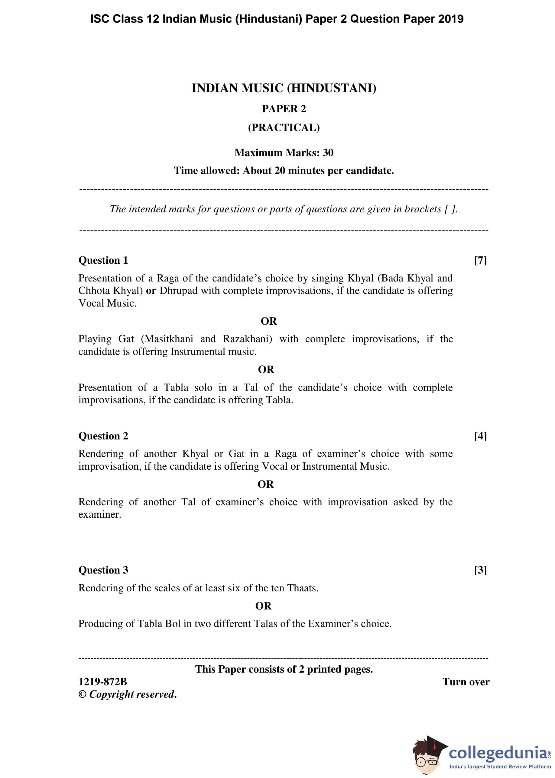 | ISC Class 12 Indian Music (Hindustani) Paper 2 Question Paper 2019 PDF | ISC Class 12 Indian Music (Hindustani) Paper 2 Answer Key 2019 PDF |