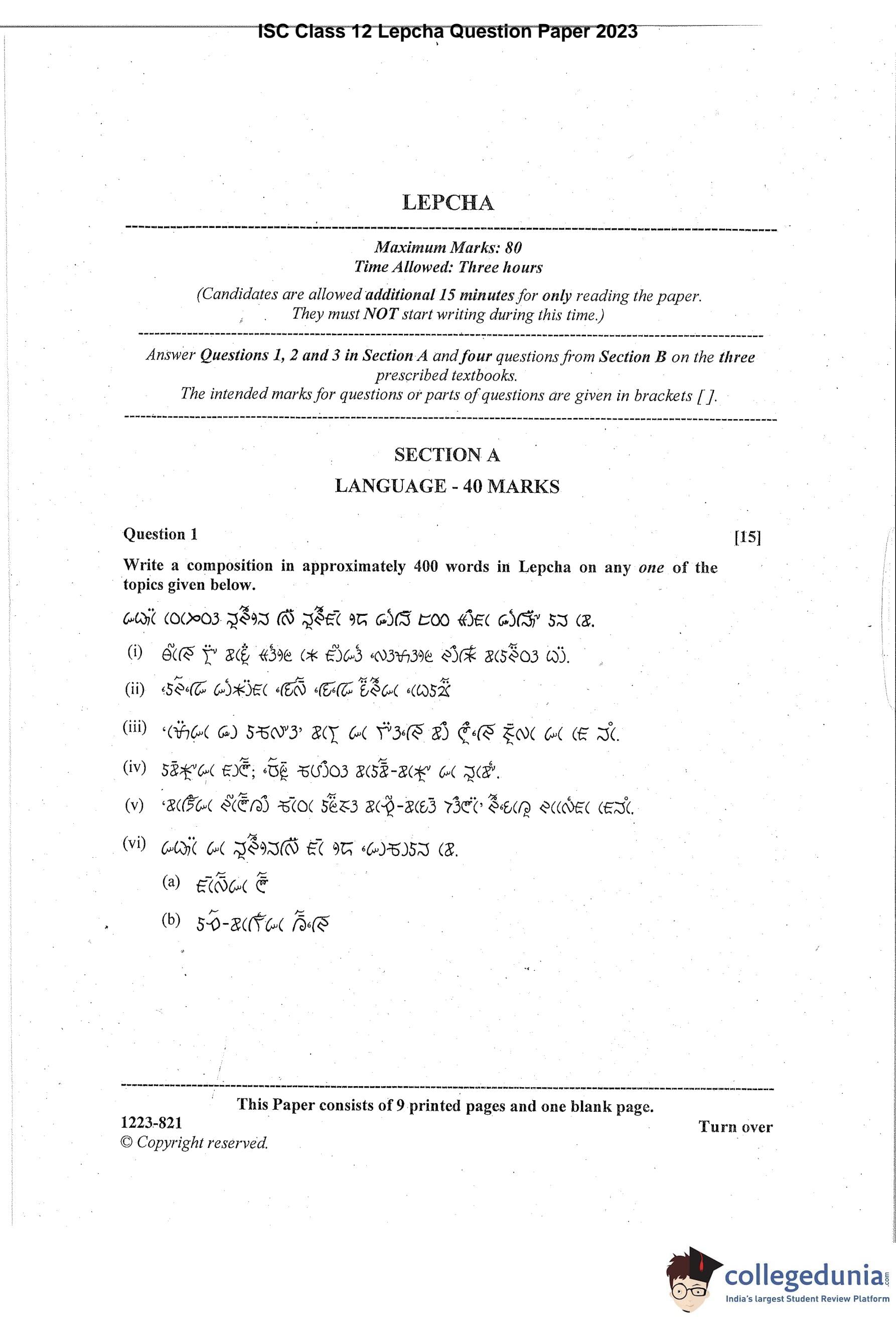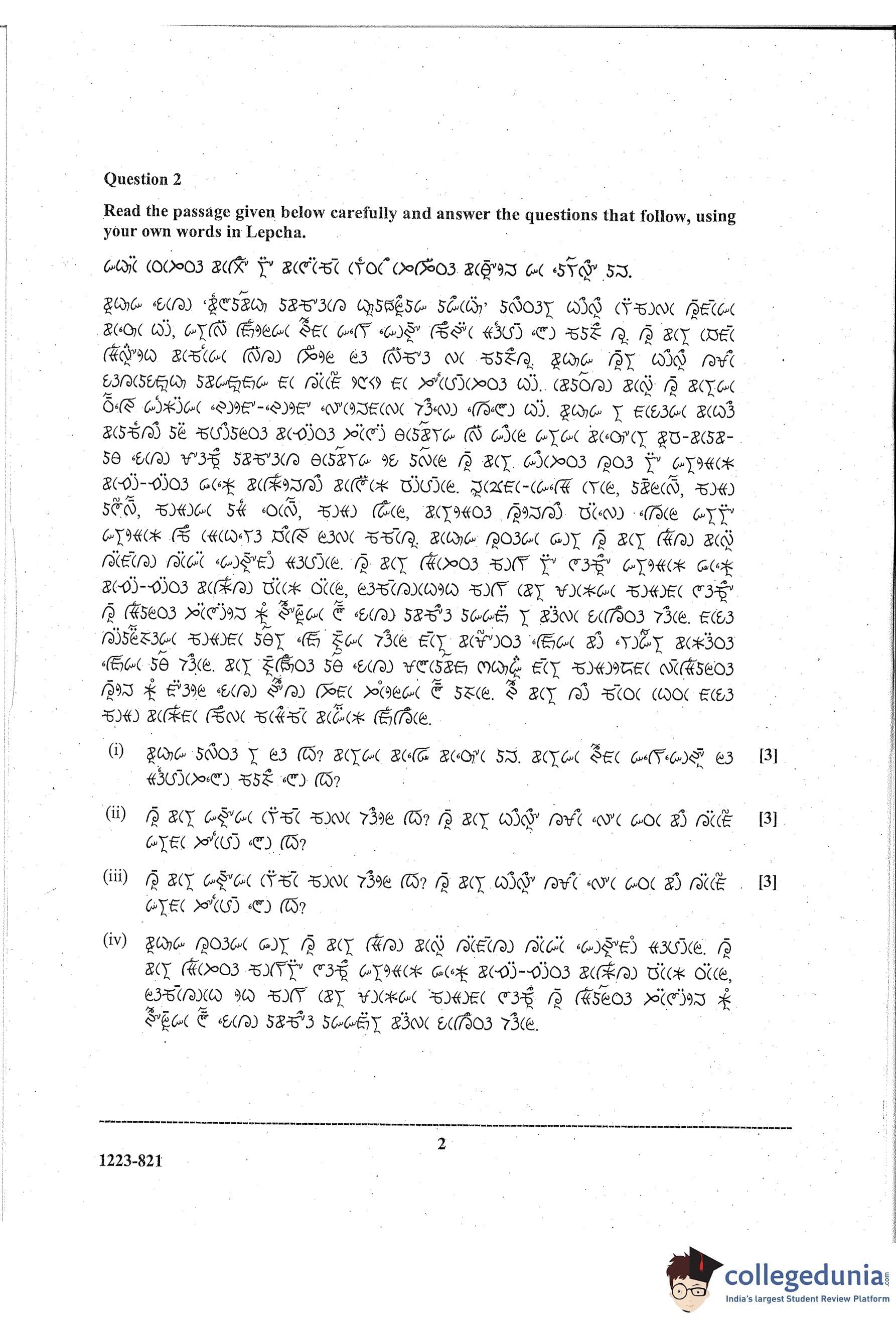 ISC Class 12 Lepcha Question Paper 2023 with Answer Key